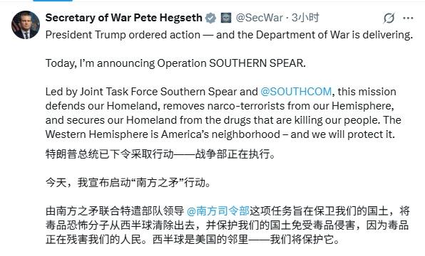 又打起来了,美国国防部长赫格塞思宣布启动“南方之矛”特别军事行动,对加勒比海地区的毒贩进行打击,此次行动覆盖西半球31个国家和地区。 美国福特级航母已经调往加勒比海,目前还没有发动攻击,“南方之矛”可视为全面攻击前的开胃菜,至于美军是否全面入侵委内瑞拉,还需观察。 赫格塞思表示“南方之矛”行动是打击加勒比海地区的毒贩,保护美国安全,真的是这样吗? 委内瑞拉拥有全球最多的石油储量,目前全部用于自用,没有出口,如果美国控制了委内瑞拉的石油,很可能大幅向全球出口,此举将会严重冲击国际原油市场,俄罗斯、伊朗等国都会损失惨重,这正是美国乐见的。 美国攻打委内瑞拉恐怕是为了更大的一盘棋。