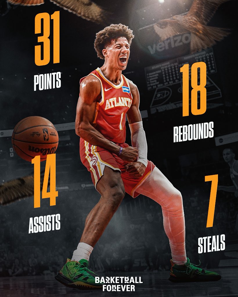 媒体BasketballForever报道。杰伦·约翰逊在亚特兰大老鹰132-122战胜犹他爵士的NBA常规赛中,交出了31分18篮板14助攻7抢断的准四双数据。