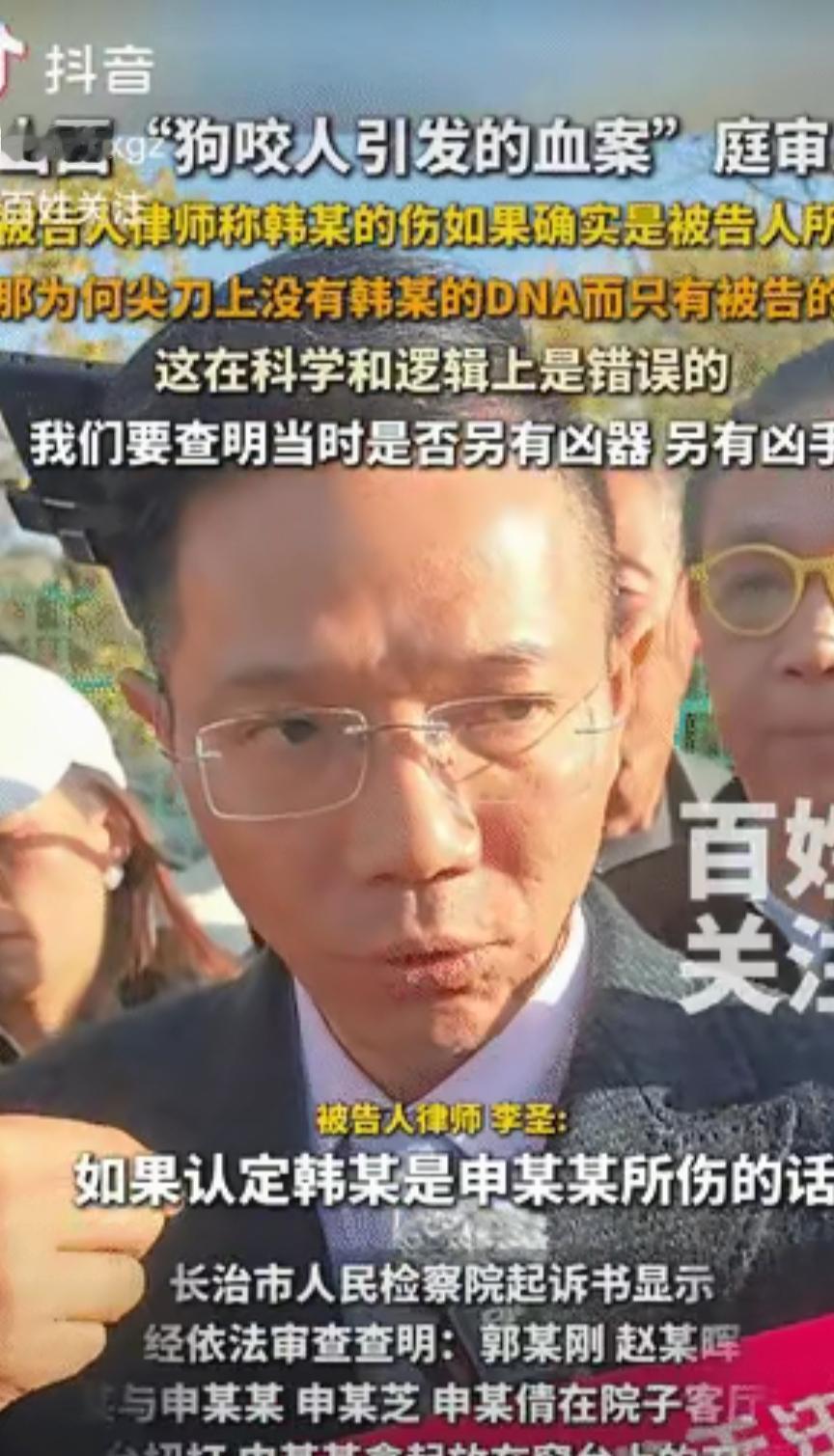 山西长治狗咬人血案惊现神反转!剔骨刀上DNA让网友炸了锅 家人们快看!山西长治这起狗咬人引发的命案,居然查出个颠覆认知的关键证据——案发现场的剔骨刀上,只有被告的DNA,压根没伤者韩某的! 2025年1月30号,一男子被邻居郭某拴在公共区域的狗咬伤,他气不过摔死了狗。事后伤者与郭某协商崩后,郭某当晚带了一群人踹门砸窗闯人家,伤者家里三位老人被逼到绝路,老父亲抄起剔骨刀反抗,结果郭某丧命、三人受伤,老人自己也伤得不轻。 现在律师李圣直接抛出疑问:要是韩某的伤是老人造成的,刀上咋会没他的DNA?当时场面黑灯瞎火乱成一锅粥,搞不好是郭某一伙人自己误伤队友,这剧情简直比电视剧还刺激! 律师喊出“黑暗中的反抗,就是正当防卫的光”,觉得老人是绝境自保。这案子判得咋样太关键了,直接关系到以后大家遇到上门挑衅该咋应对。你觉得这是正当防卫吗?DNA证据能翻盘不?