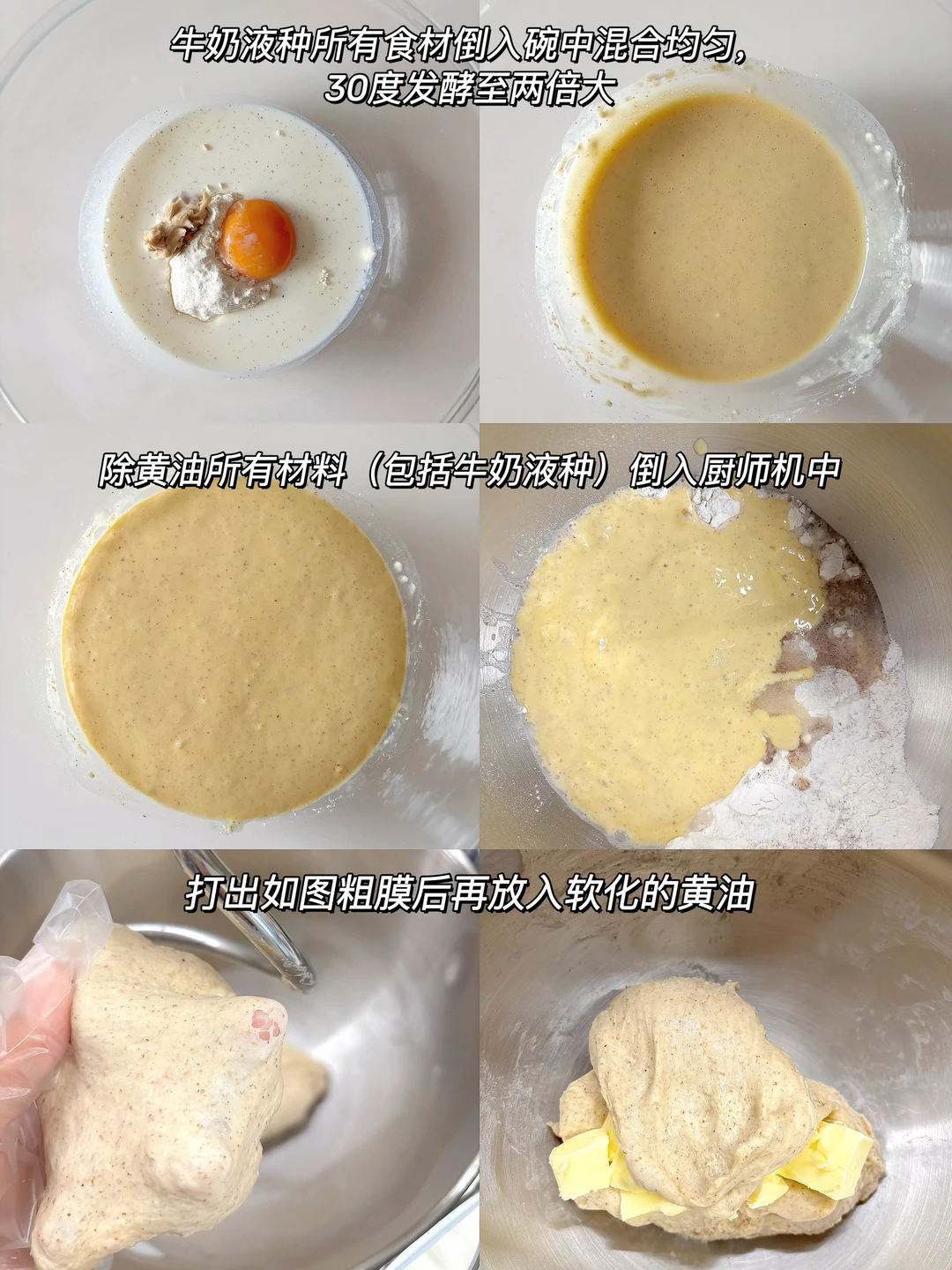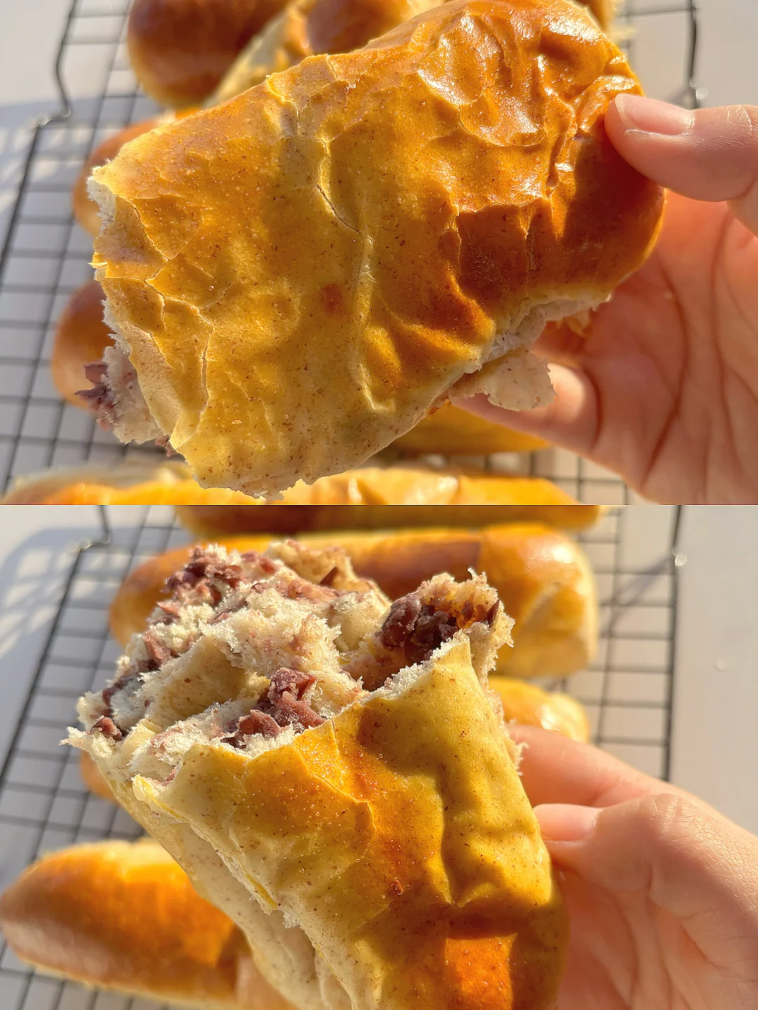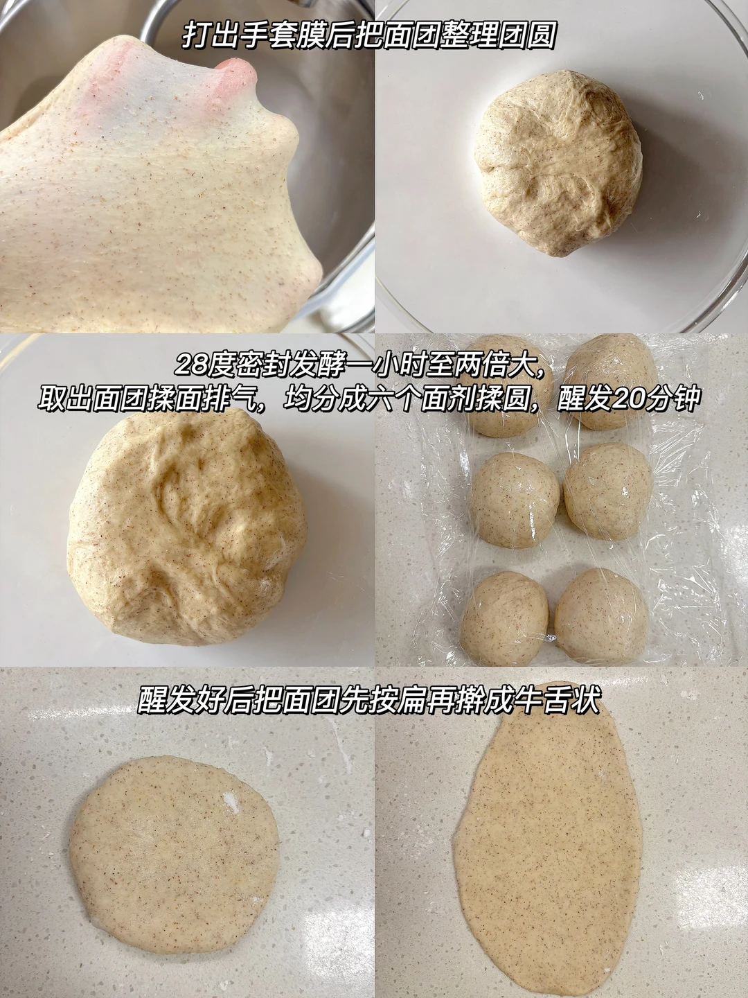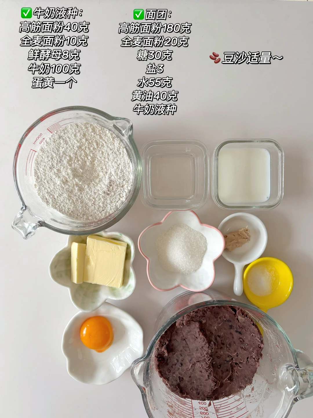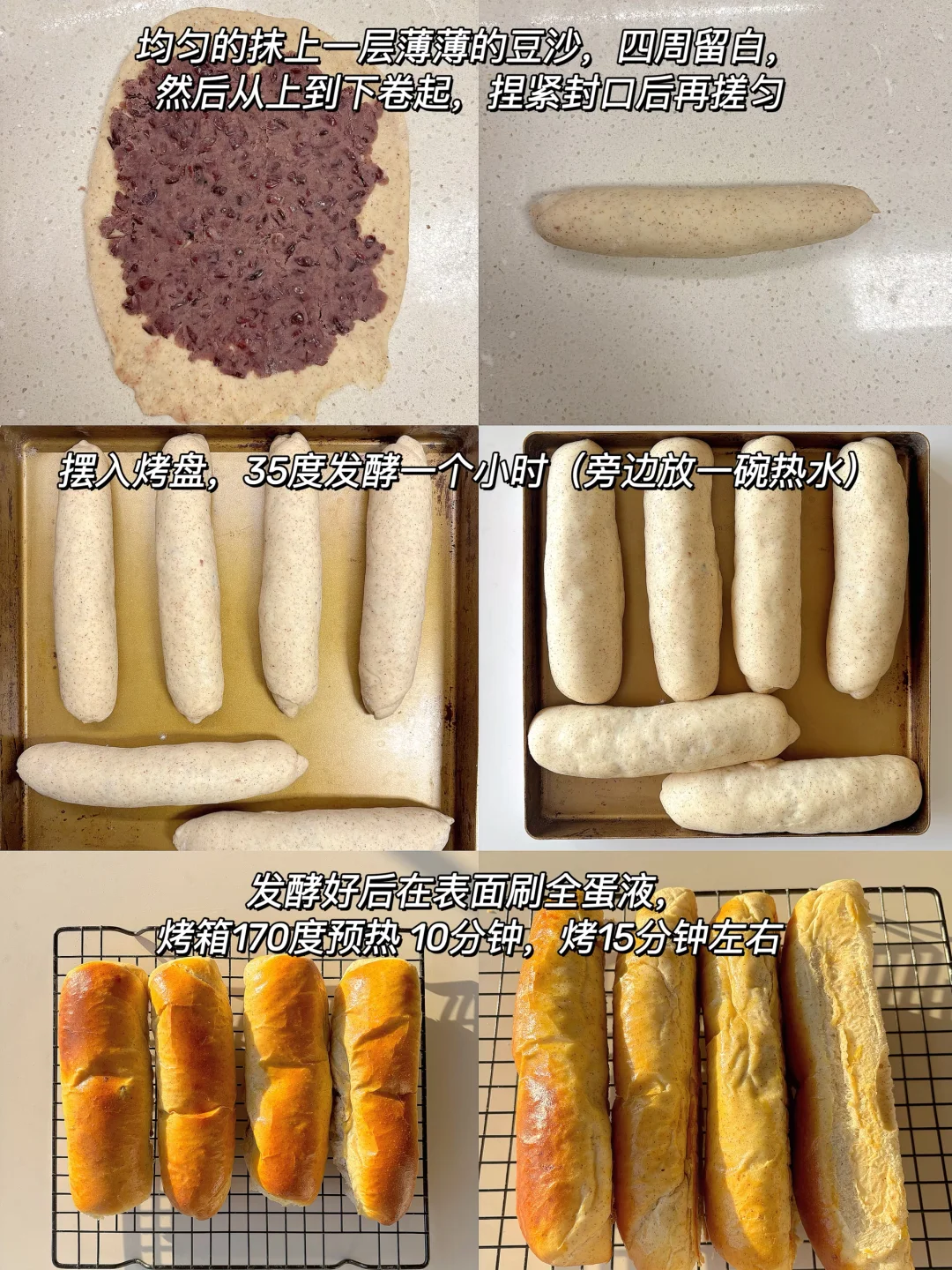 🎈准备食材: 1️⃣ 牛奶液种:高筋面粉40克,全麦面粉10克,鲜酵母8克,牛奶100克,蛋黄一个; 2️⃣面团:高筋面粉180克,全麦面粉20克,糖30克,盐3,水55克,黄油40克,牛奶液种; 🫘 豆沙适量(200克红豆做的) 🎈制作步骤: 1️⃣牛奶液种所有食材倒入碗中混合均匀,30度发酵至两倍大; 2️⃣除黄油所有材料(包括牛奶液种)倒入厨师机中,打出如图粗膜后再放入软化的黄油; 3️⃣ 打出手套膜后把面团整理团圆,28度密封发酵一小时至两倍大; 4️⃣取出面团揉面排气,均分成六个面剂揉圆,盖上保鲜膜醒发20分钟,醒发好后把面团先按扁再擀成牛舌状; 5️⃣ 均匀的抹上一层薄薄的豆沙,四周留白,然后从上到下卷起,捏紧封口后再搓匀,摆入烤盘,35度发酵一个小时(旁边放一碗热水) 发酵好后在表面刷全蛋液。 🎈烤箱170度预热10分钟,烤15分钟店右,上色后记得盖上锡纸