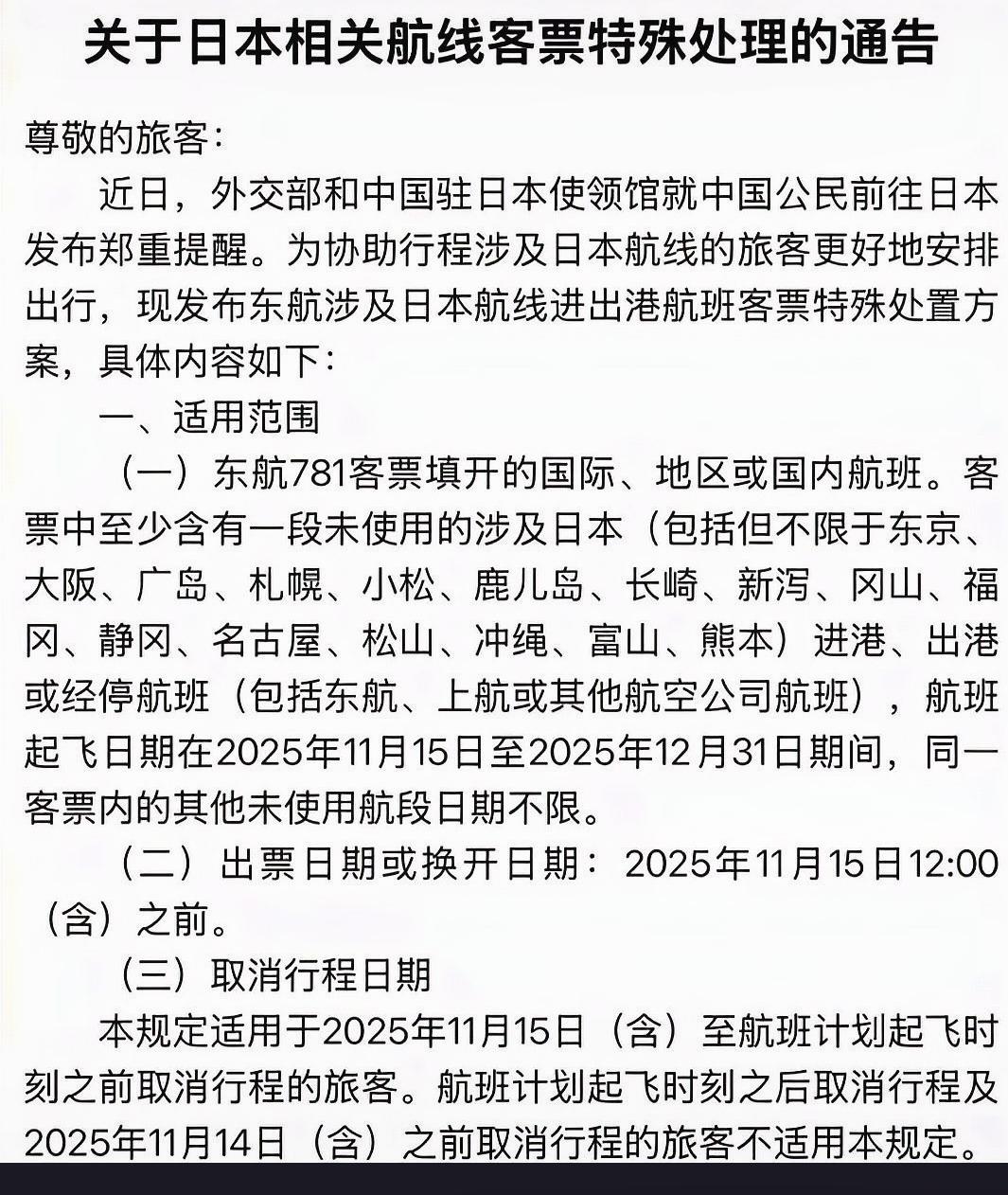 三大航司推出涉日机票免费退改政策 获社会广泛关注 2025年11月15日,中国国际航空、南方航空、东方航空三大航司同步发布通知,宣布对涉及日本航线的客票实施特殊退改政策,引发社会广泛关注。该政策响应外交部近期发布的出行提醒,旨在为旅客提供更灵活的出行选择,减轻相关不确定性带来的经济负担,适用期限为即日起至2025年12月31日。 根据各航司公布的细则,国航999开头客票可在有效期内免费变更一次,未使用航段退票免收手续费;南航784开头客票退票免手续费,首次变更至相同航程航班免收变更费;东航781开头客票可免费变更至原航班前后3天内的航班,未使用航段非自愿退票无手续费,适用航线覆盖日本多地进出港及经停航班。 此次政策不仅明确了客票出票时间、适用航程等核心条件,还通过技术升级保障退改服务顺畅,多家航司已临时扩充客服坐席、优化订票系统。政策发布后,相关咨询量显著增长,已有旅客成功办理全额退票。这一举措既体现了航司的社会责任与服务担当,也为旅客应对出行风险提供了切实保障,后续海南航空等多家航司也相继跟进推出类似方案,进一步扩大了政策惠及范围。机票退订 日本机票 机票退一赔三 上海直飞日本 直飞日本 国航日本航班 机票退改规则