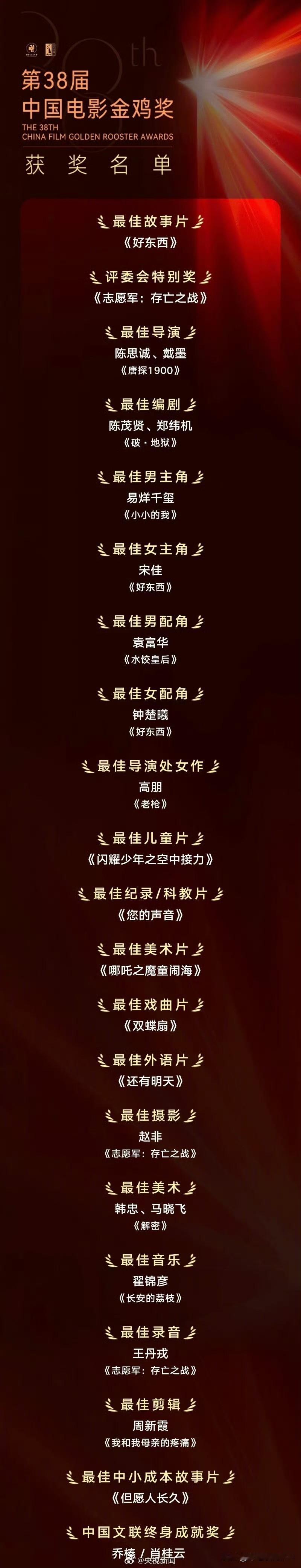 金鸡奖获奖名单,影帝易烊千玺,影后宋佳,实至名归 这次最大的赢家感觉不是易烊千玺,而是《好东西》这个团队呀!女主角宋佳获得最佳女主角,连钟楚曦都获得了最佳女配,还获得一个最佳故事片 这么多奖项加一起,无疑是最大赢家了,其他的团队基本都只有一个奖