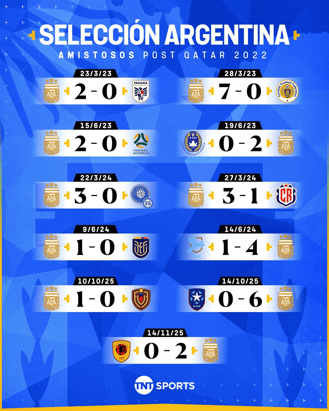 2022年卡塔尔世界杯之后,阿根廷在11场友谊赛里保持不败