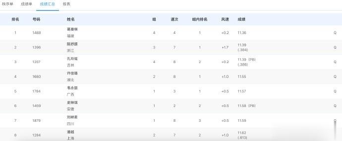 直播吧11月16日讯全运会女子100米预赛,葛曼棋11秒36排名第一,陈妤颉11秒39第二,孔玲瑶11秒39刷新PB排名第三。韦永丽、刘峡君、潘越、袁琦琦等名将也都晋级半决赛。