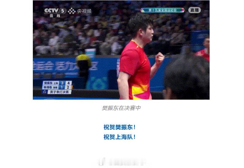 11月16日,第十五届全运会男单金牌赛,樊振东vs林诗栋,上海队 4-1战胜海南队 ,五局比分为:11-9、8-11、11-5、11-3、11-4。樊振东也成为继马龙后全运乒乓第二位卫冕男单冠军的人。随后,上海交通大学发文祝贺樊振东:上海队选手,上海交通大学媒体与传播学院2022级学子樊振东,以4∶1战胜海南队选手林诗栋夺得冠军。樊振东四次参加全运会乒乓球比赛,四次闯入男单决赛,成为全运会历史上继马龙之后第二位在男单项目上实现卫冕的选手……祝贺樊振东!祝贺上海队!