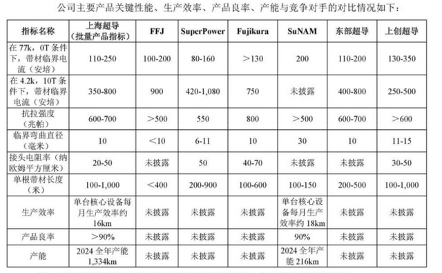 其中,针对上海超导主要产品关键性能、生产效率、产品良率、产能与竞争对手的对比情况,公司通过表格对比的方式做了解释说明。