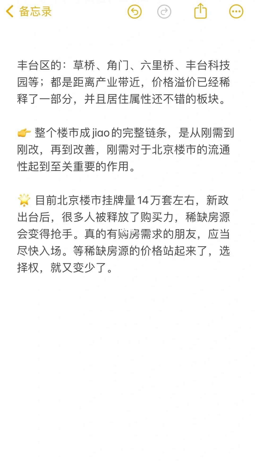 🌛 丰台区的:草桥、角门、六里桥、丰台科技园等都是距离产业带近,价格溢价已经稀释了一部分,并且居住属性还不错的板块。
