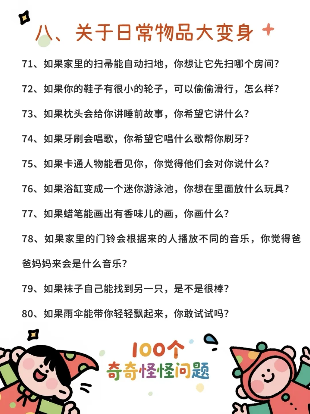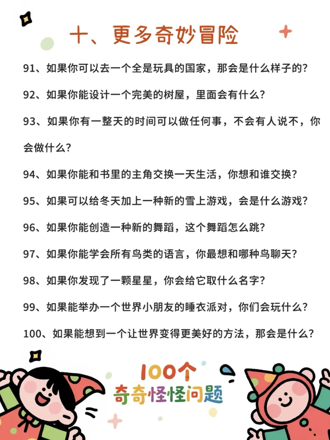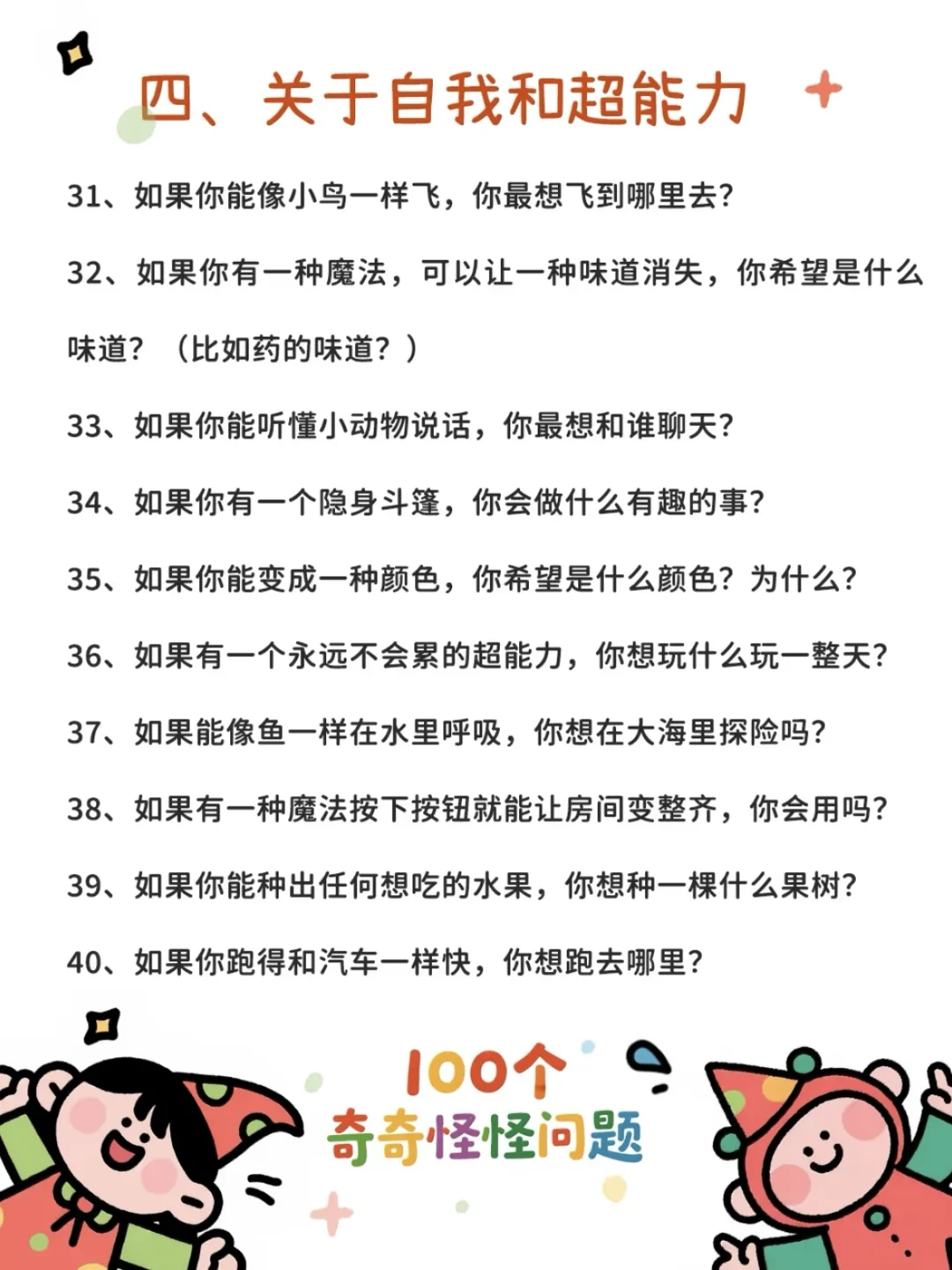 不知道各位爸爸妈妈有没有同感——当孩子进入“话匣子”模式后,那些日常的一问一答,或者平淡的话题,有时很难引起他们的兴趣。 其实,他们的小脑袋里更爱琢磨那些天马行空的问题,充满想象力的假设,和看似“奇奇怪怪”却很有意思的想法。 我整理了100个特别适合和孩子聊的奇思妙想话题,用词简单,却充满乐趣与讨论空间。这些话题不仅能点燃孩子的想象力,也能让我们悄悄走进他们那个奇妙又独特的小世界。 ·