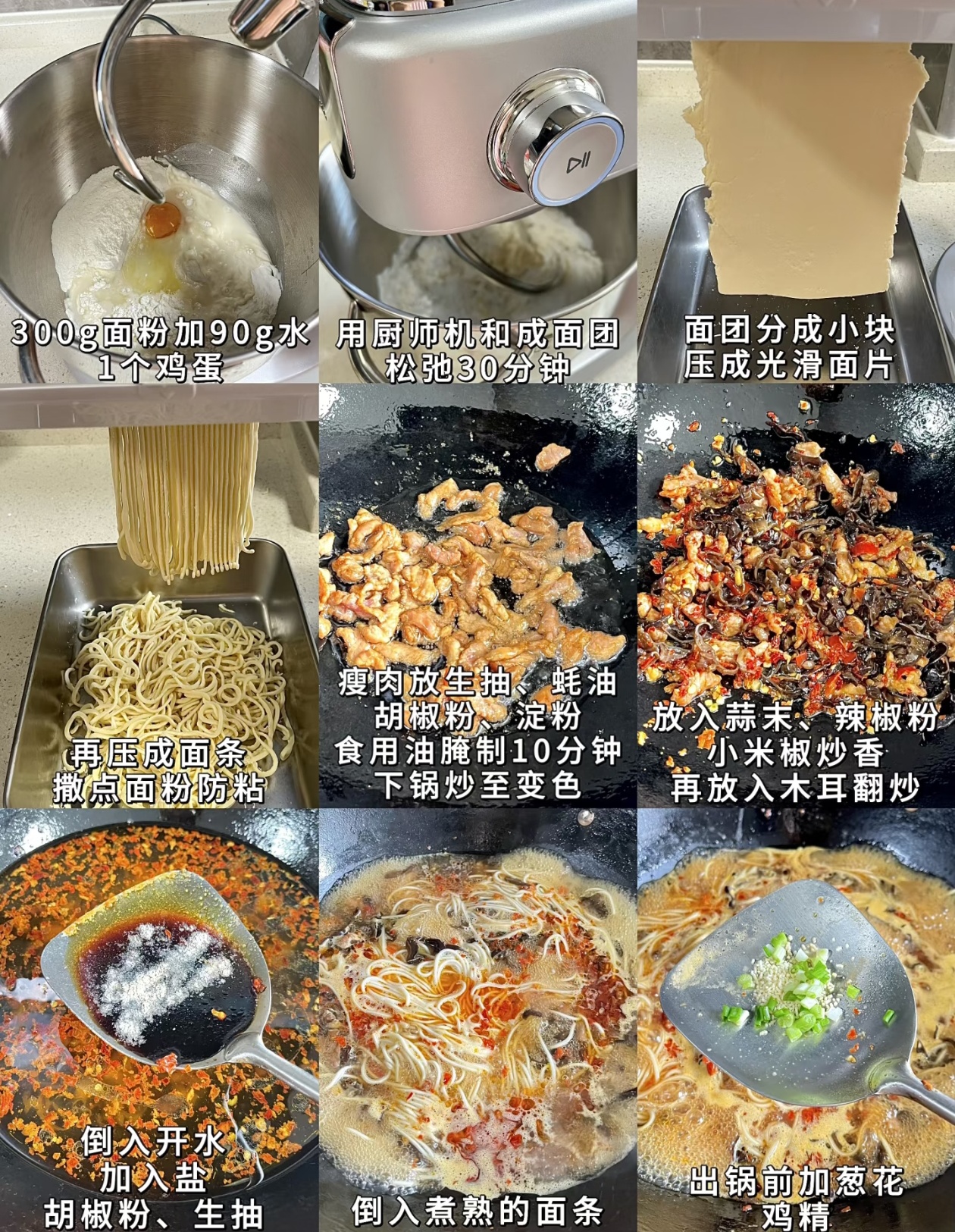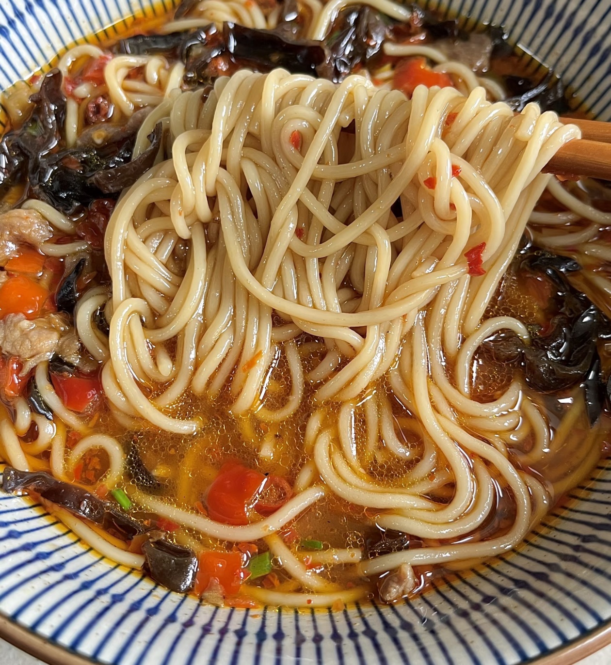 端上桌的那一刻,红亮的汤汁、金黄的面条、黑亮的木耳,再点缀着翠绿的葱花,光是看着就让人垂涎欲滴。夹一筷子面条,裹满了鲜辣的汤汁,入口爽滑又带着嚼劲,木耳脆爽,肉丝嫩滑,每一口都是层次丰富的满足感。我妈上次来家里,尝了一口就眼睛发亮,追着问我配方,还说让我别上班了,直接去开店。