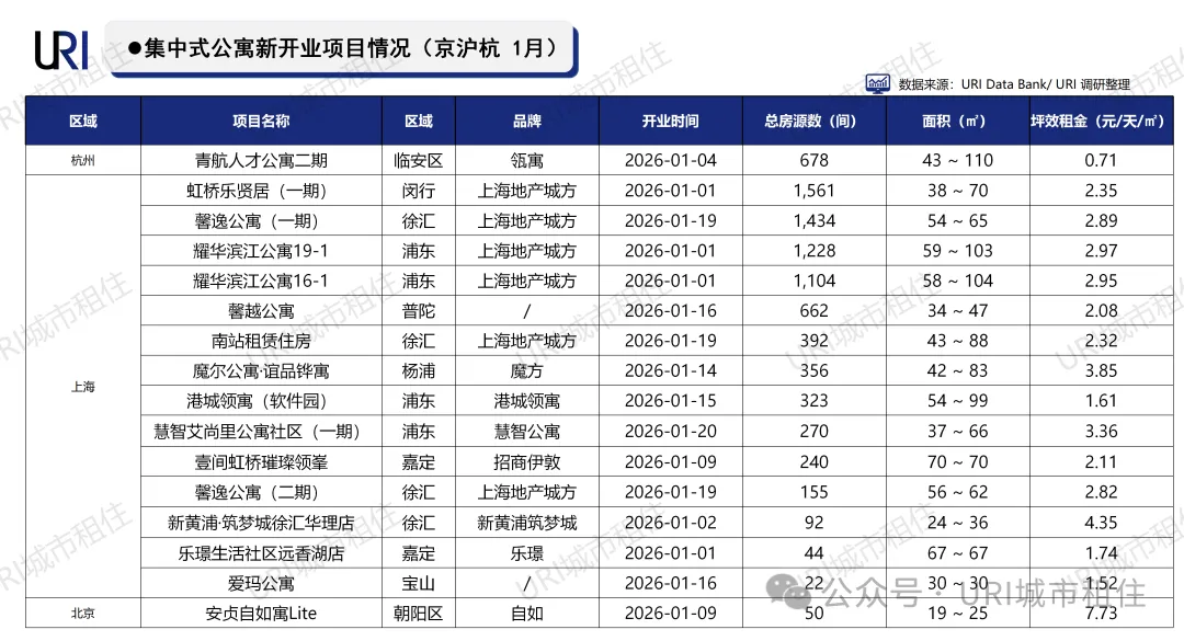 1月,三城共有16个集中式公寓项目新入市,其中上海集中入市14个,北京、杭州各入市一个项目。其中上海多个项目为保租房,单项目房源超千间,主要由上海地产城方等国企系品牌推动,其中URI城市租住调研发现,表格中城方项目为公租房转保租房项目。