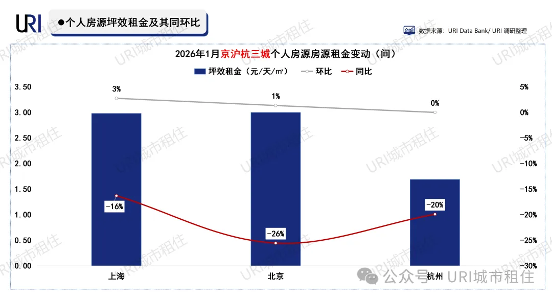 三城个人房源坪效租金呈现“环比企稳、同比深度回调”的分化走势。其中,上海、北京租金水平接近(约3.0元/天/㎡),环比小幅上涨,显示短期价格韧性;杭州租金(1.69元)环比持平。但三城租金同比均显著下降,降幅在16%-26%之间,北京同比降幅最大(-26%)。