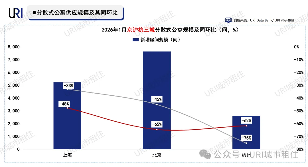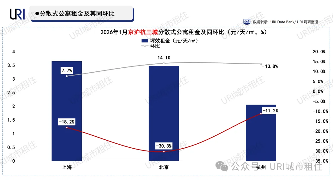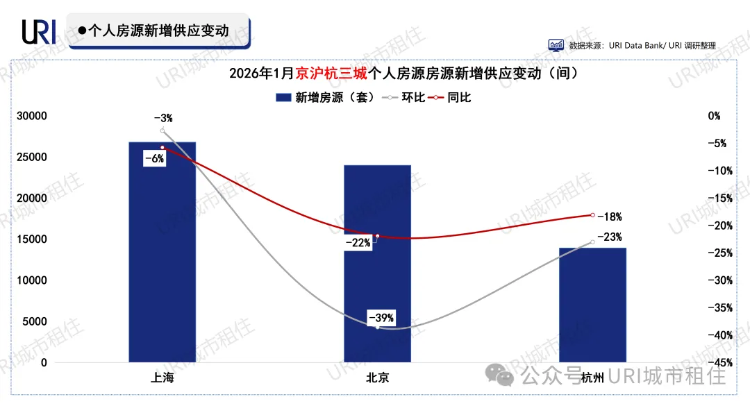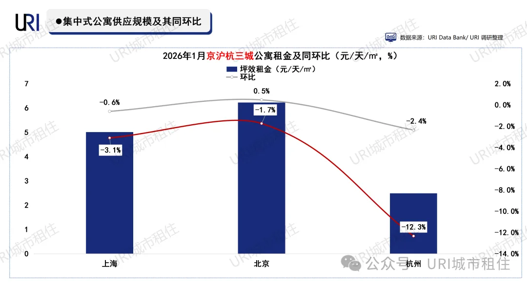 1月,三城集中式房源租金整体呈现平稳调整态势,环比波动均在±2.5%以内,其中北京微涨0.5%,上海、杭州略有下调。同比来看,三城租金均小幅回落,北京(-1.7%)和上海(-3.1%)降幅温和,杭州降幅稍大(-12.3%)。