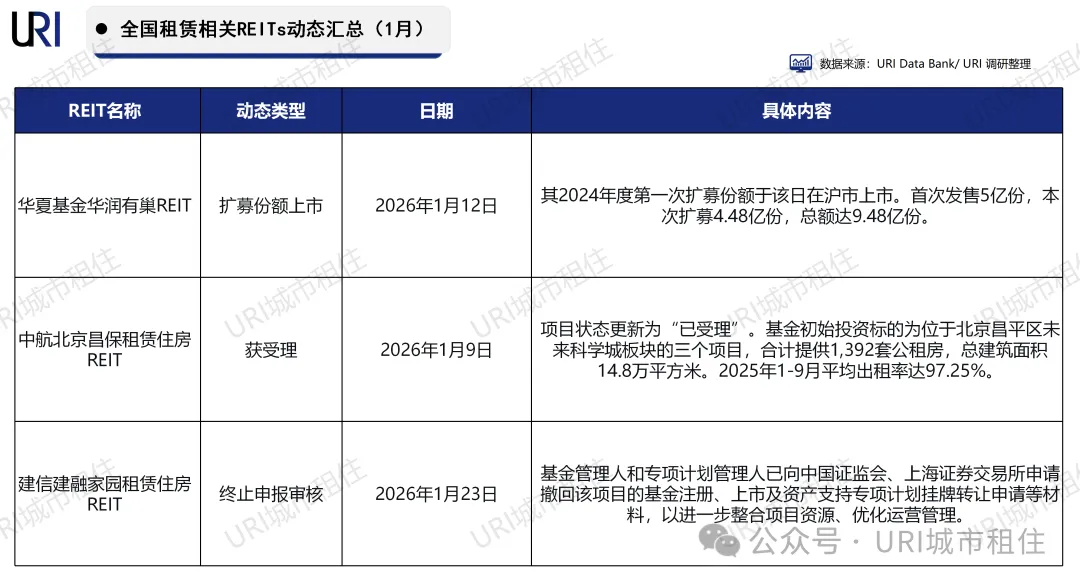 其次,华夏华润有巢REIT扩募份额成功上市;中航北京昌保租赁住房REIT项目获得受理,稳步推进;而建信建融家园租赁住房REIT则为整合资源主动终止申报。这既体现了市场在政策支持下的持续扩容,也反映了不同发行主体根据自身情况进行的战略调整。