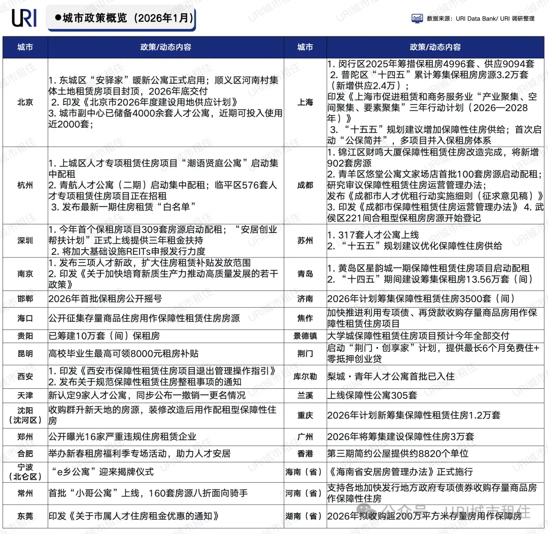 1月,全国多城市密集出台租赁住房相关政策,重点围绕扩大房源供应、强化人才安居保障、规范运营管理等方面展开。各地通过新建、改造、收购存量房等方式积极筹措保障性租赁住房,并推出专项公寓面向青年、人才、骑手等群体配租。上海、成都等地持续推进“公保简并”与运营管理制度化,河南、湖南等省则探索利用专项债收购存量商品房转作保障房。