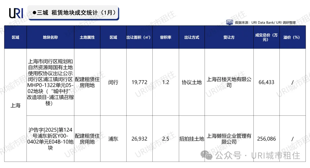 1月,上海在闵行、浦东两区完成两宗配建租赁住房用地的出让。其中,闵行区浦江镇地块采用协议出让方式,由上海召楼天地有限公司以约6.64亿元竞得;越秀地产通过公开挂牌方式以人民币25.61亿元竞得上海市浦东新区Y00-0402单元E04B-10住宅地块,占地面积约26,931.62㎡,根据规划限制条件,地块内配建公共服务设施计容面积约1,260㎡,建成后无偿移交给政府指定部门。