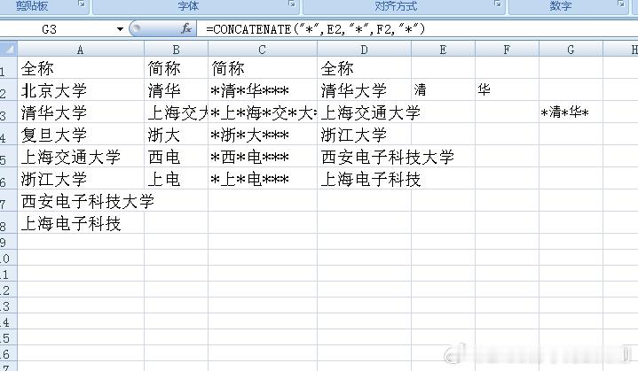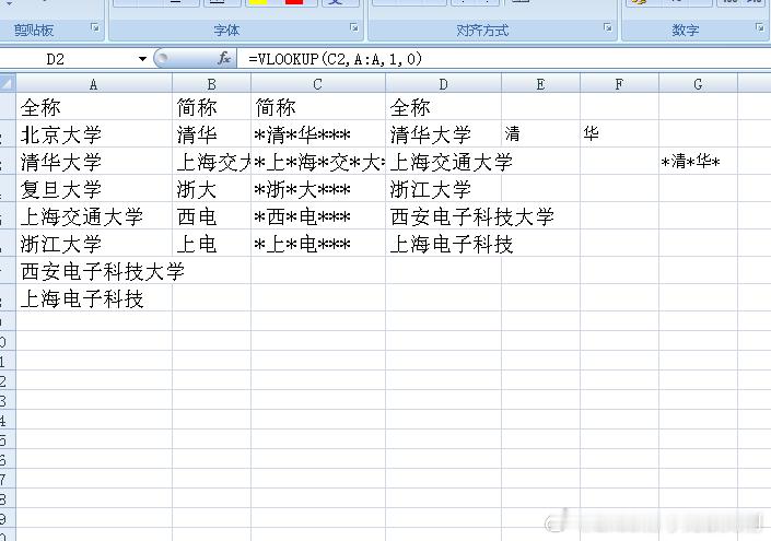 Vlookup复杂的简称查找全称,图一这个简称没用了,只能自己加辅助,给每个简称的关键词加*,然后vlookup.