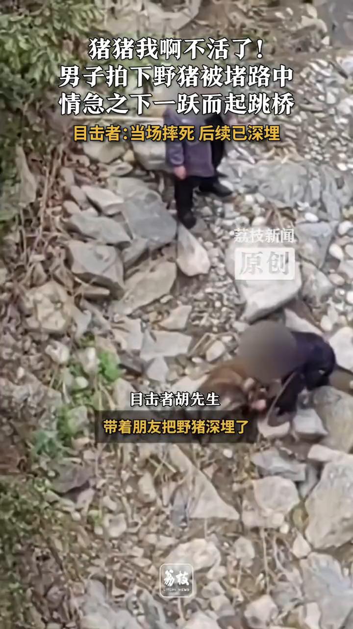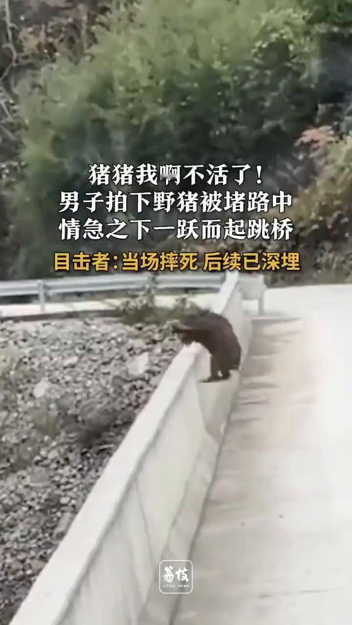 猪猪我啊不活了!男子拍下野猪被堵路中,情急之下一跃而起跳桥。目击者:当场摔死后续已深埋。 荔枝新闻。 目击者胡先生:跑过去那边有人家骑得摩托车,退回来又看见我的大车,没办法就从桥上跳下去了,20多米的桥摔死了。带着朋友把野猪深埋了,不然会发出臭味。