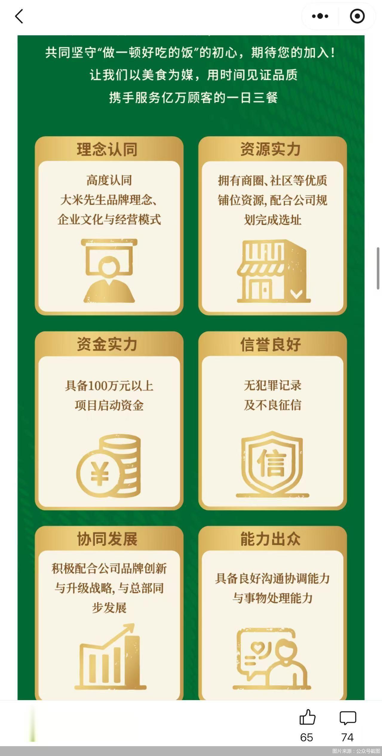 继乡村基后,旗下品牌大米先生也放弃单打独斗。近日,深耕直营模式十余年的中式快餐品牌大米先生,正式发布合作伙伴招募公告,打破自2011年创立以来的纯直营模式,距其8月门店突破1000家仅隔数月。大米先生此次开放合伙设立了明确的筛选标准,除认同企业理念、信誉良好、具备协同发展意识与沟通能力外,更核心的是资源与资金实力。