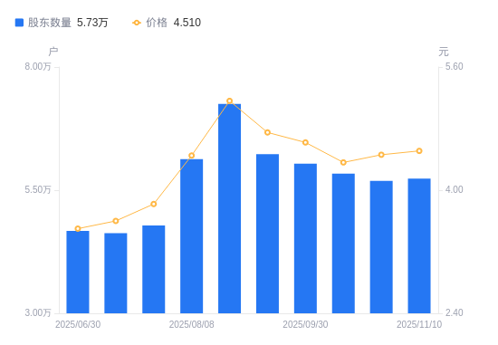 日期A股户数(户)流通A股户均持股数(股)户均持股市值(万元)2025-11-105732933348.9215.042025-10-315690633459.1014.922025-10-205833632638.9114.232025-09-306039331527.2214.572025-09-196232430549.9214.512025-08-207251126257.9913.552025-08-086129831061.2613.822025-07-314784539795.0315.202025-07-184629141130.9614.812025-06-304670540766.3714.27