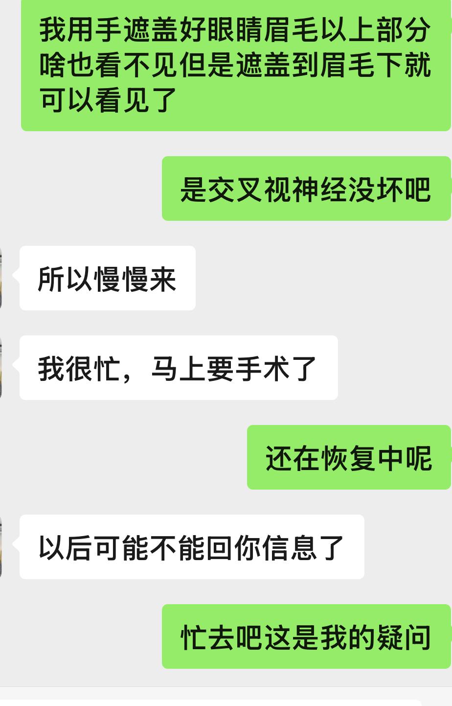 我垂体瘤手术一年了,非常期望目前有一个新的医疗方式治疗我的病。 我开始疯狂的关注抖音上的干细胞治疗的人,关注了,不止10个人。还加微信,最后明白干细胞治疗眼睛48万,吓死了!没有想到会是这样的结果。 之前与厦门华西医院给我做手术的医生咨询后,目前的脑机接口和移植手术这两个我都不适合用,我非常失望。 他还告诉我,以后可能不能接听我的电话。可能我问的问题,他很烦他才说出这种话。
