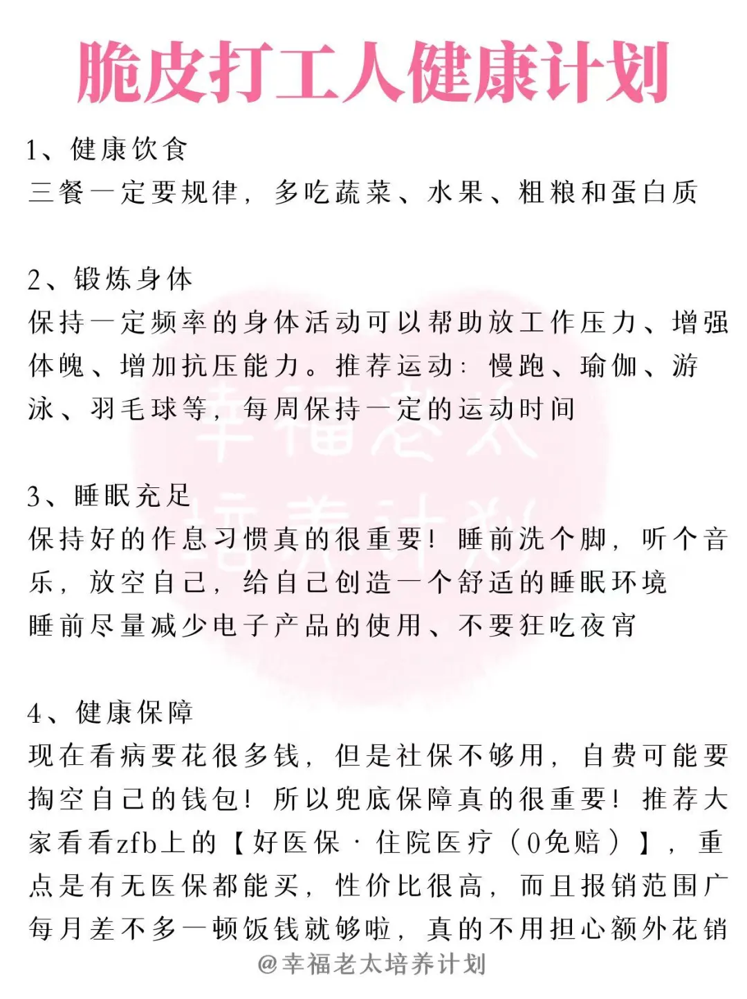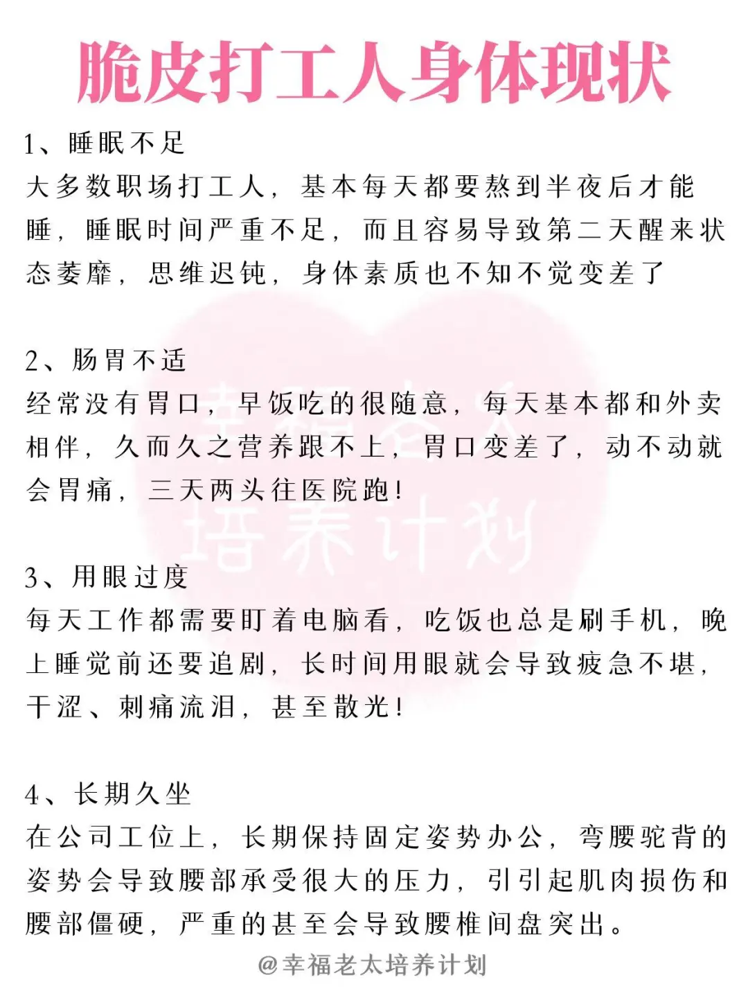 ❓你是不是经常没吃早餐去上班,一整天坐在工位上,然后中午点个外卖,眼睛也是一直盯着屏幕,即便下班到了晚上,也是熬夜追剧玩手机😭其实以上的生活习惯其实非常不好❌对身体健康有很大的威胁💔今天分享几个脆皮打工人的健康自救指南,赶紧学起来吧❗️