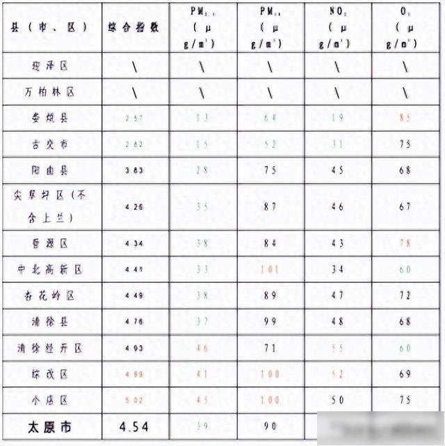 1.综合指数、PM10、NO2和O3指标排名前两位的标为绿色,排名后两位的标为红色;