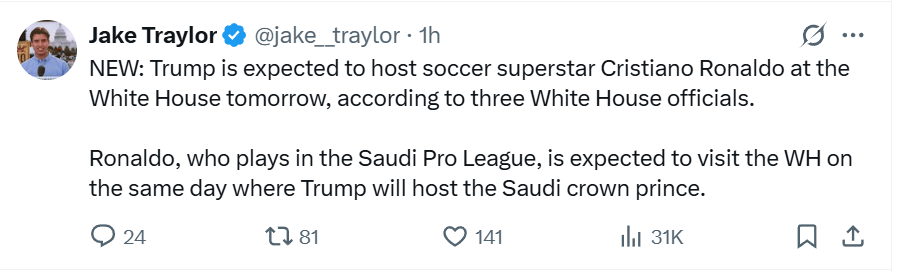 C罗目前在沙特联赛利雅得胜利效力,而根据计划,特朗普将在同一天接待沙特王储小萨勒曼。