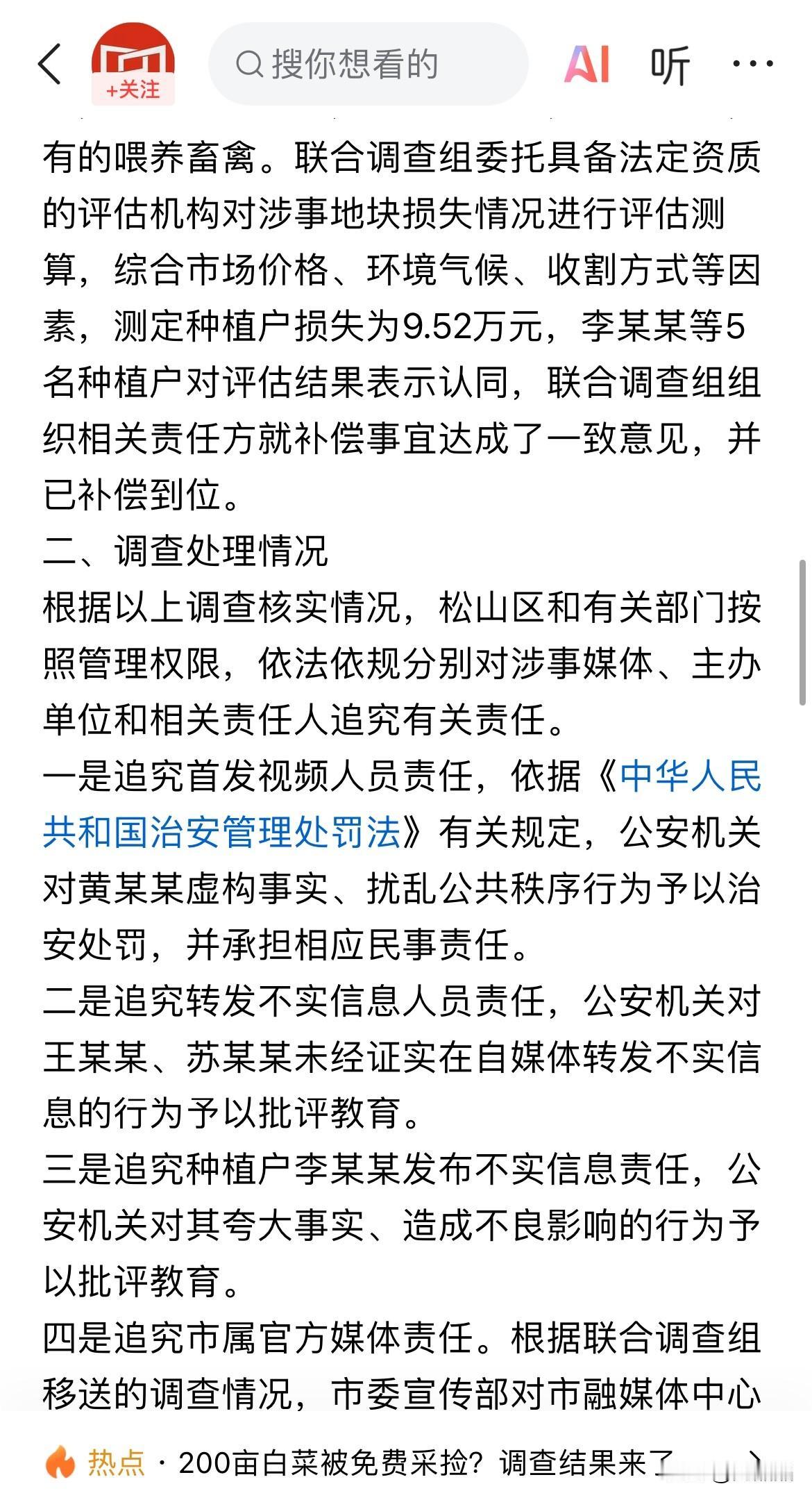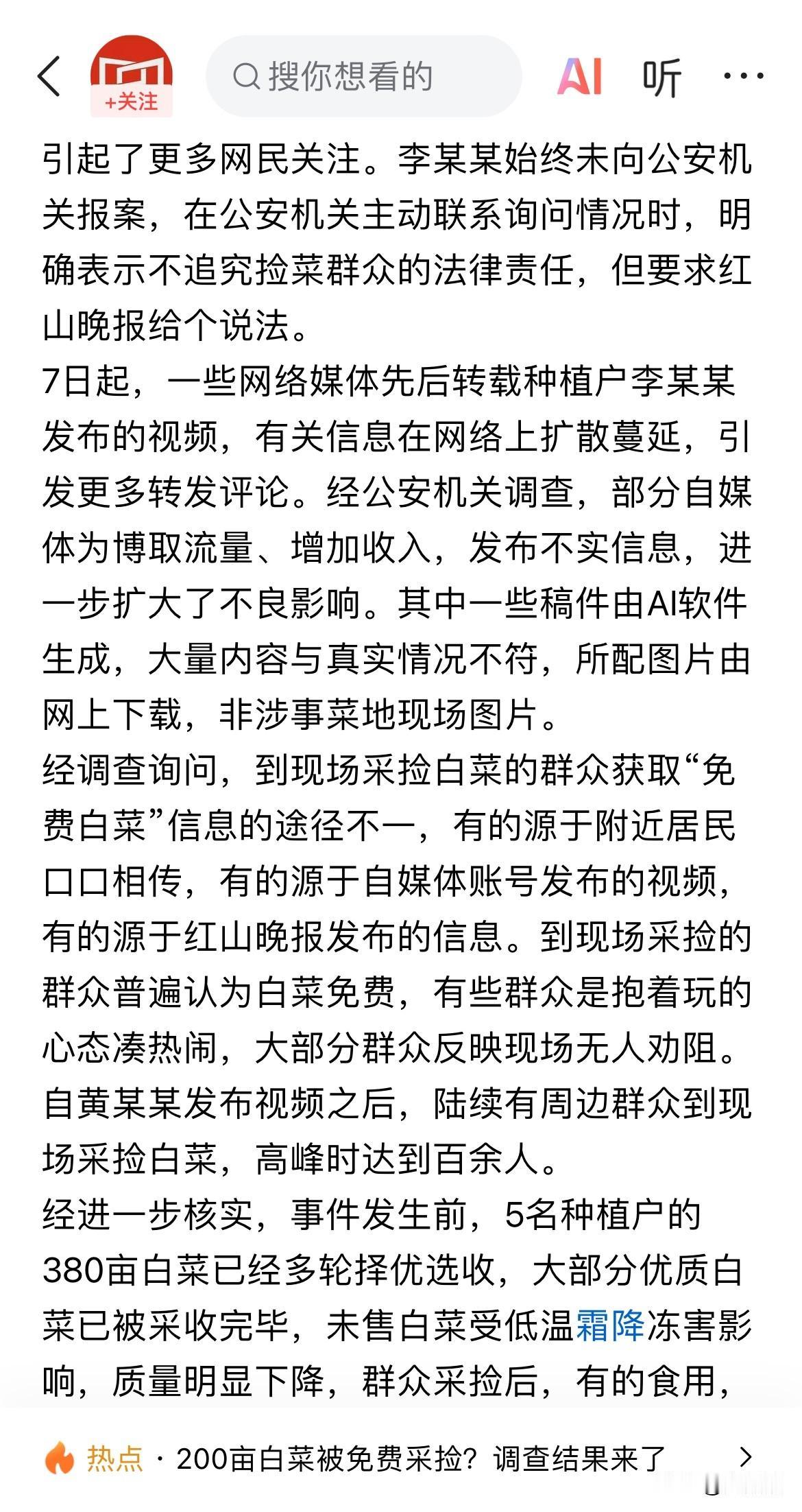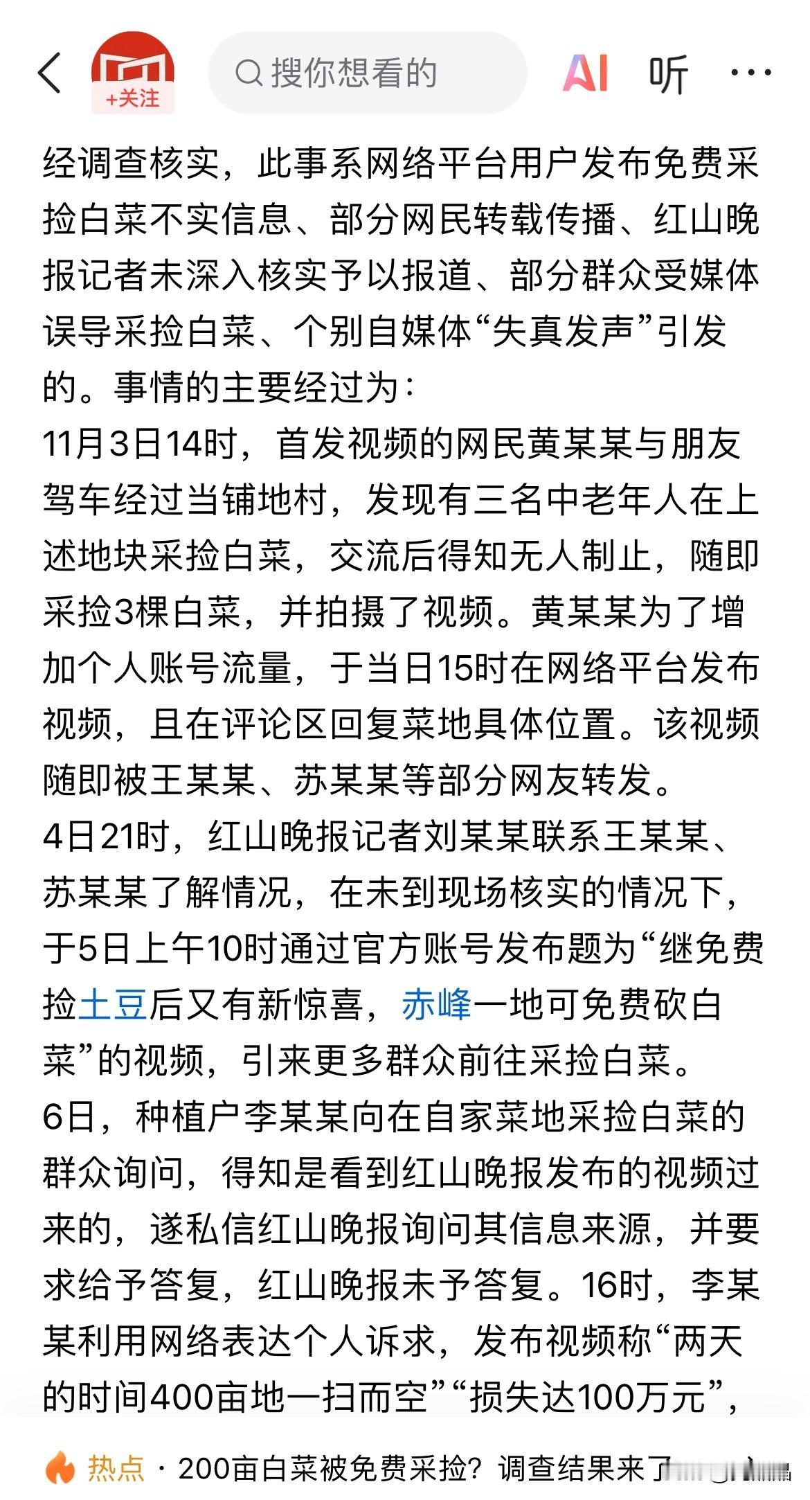 200亩白菜被免费采摘后续,红山晚报致歉,不实报导记者被吊销新闻记者证。 内蒙古免费捡白菜一事皆源于对不实信息的传播,首发视频者没跟菜地种植户证实便发布到网络,网友包括红山晚报记者未经核实转发,导致菜地被免费采摘。菜农李某发布夸大事实宣称损失100多万视频被推上热搜,进而引发关注和调查。目前菜农已获得9.52万损失赔偿,相关不实信息发布者被处罚或者批评教育。 流量至上的自媒体时代,有些人为了流量不惜夸大事实、凭空捏造来吸引眼球,殊不知已经触犯法律界限。网络非法外之地,造谣传谣不可为。 如果你刷到免费捡白菜,你会去薅这羊毛吗? 图源:界面快讯