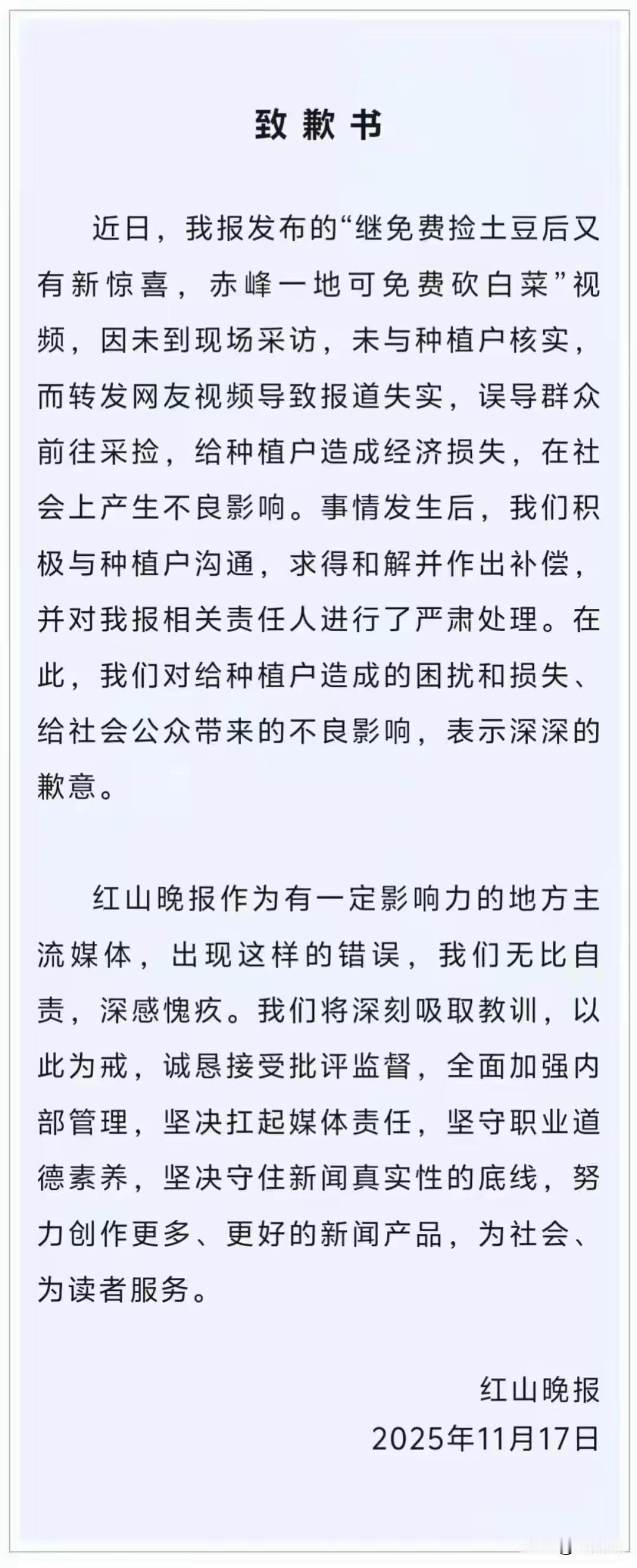 200亩白菜被免费采摘后续,红山晚报致歉,不实报导记者被吊销新闻记者证。 内蒙