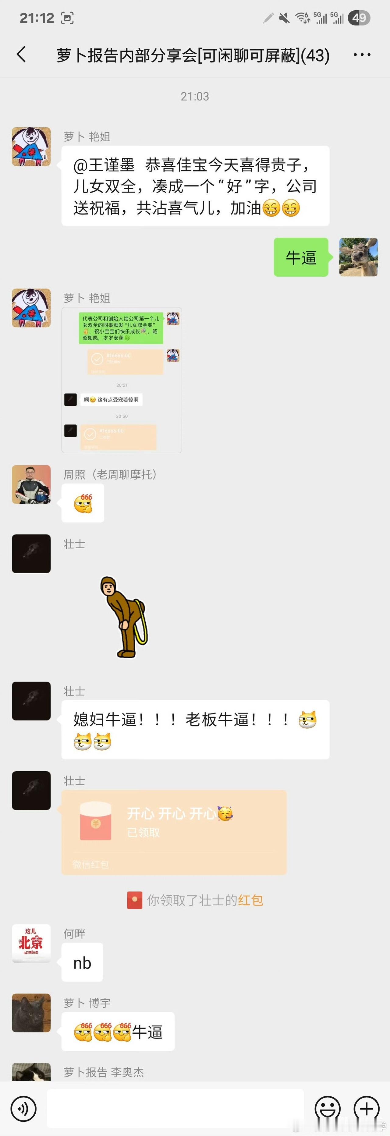 陈震同事儿女双全发大红包,把他羡慕坏了! 就在刚才,陈震分享了他们公司内部的一件事,他们的同事家里面添丁了,因为之前一个女儿这次生了个儿子,所以凑成了一个好字! 因此,为了奖励这个同事,公司直接给这位第一个凑成好字的同事发了16,666的大红包,这个操作把陈震本人都看羡慕了,毕竟他只有两个好儿子! 而且他最近在很多互动当中,都提到羡慕人家有女儿的,他的大儿子已经满了18岁了,小儿子也差不多10岁了,如果现在再添一个女儿,他是应该没问题的,他老婆的年纪估计要再生一个女儿,还是有点不容易了。 当然,也有人给他支招,实在想要有人的话,可以上一点科学技术,这个事情也不是不可能完成,这你受得了[捂脸]