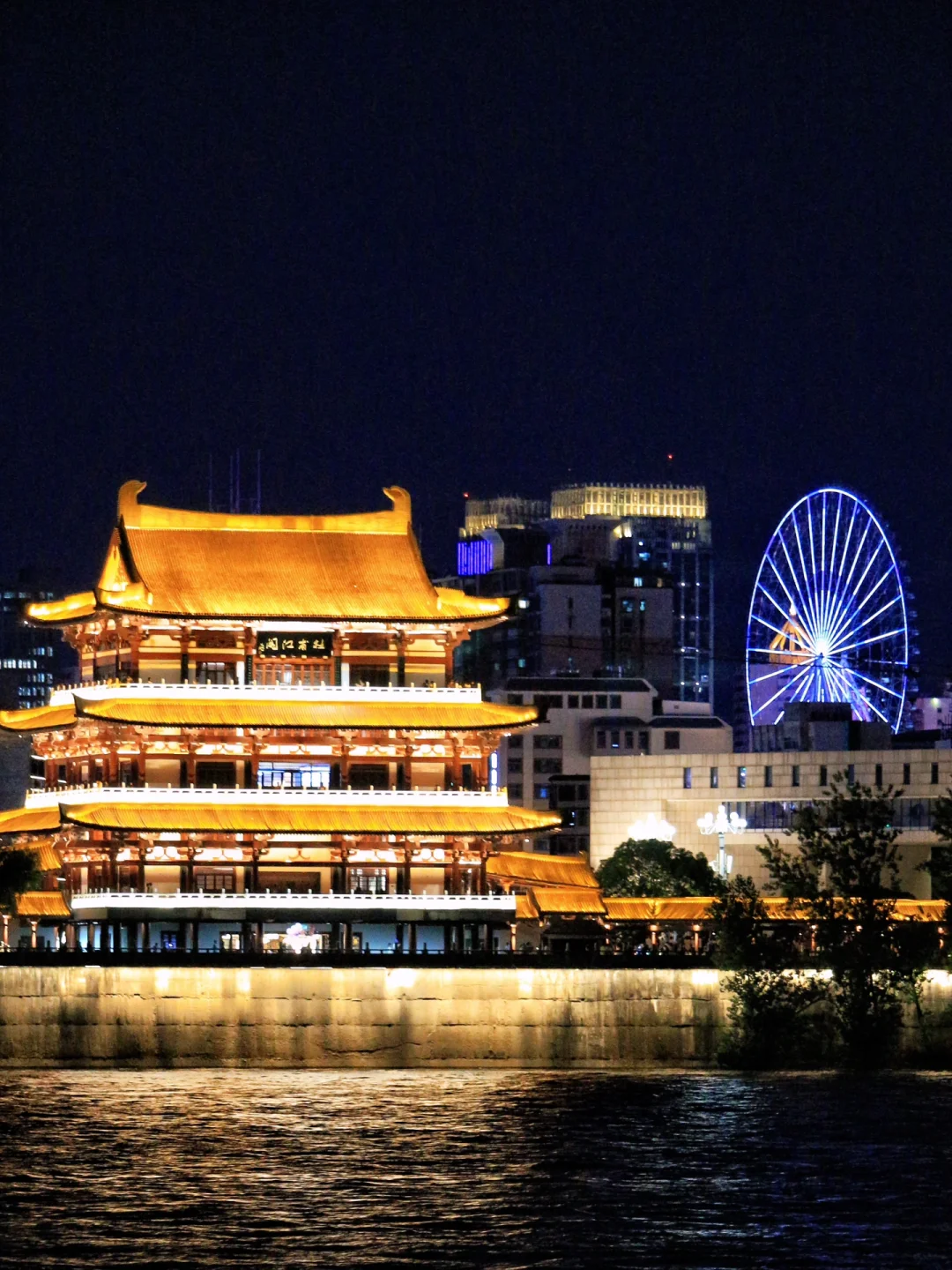 4⃣️可以在下午5点左右抵达景区,不会太晒,又可以赏到江边日落🌅,非常浪漫;回程时天完全黑下来还可以看到江对岸的灯光秀,换一个角度看杜甫江阁和摩天轮🎡也非常有韵味