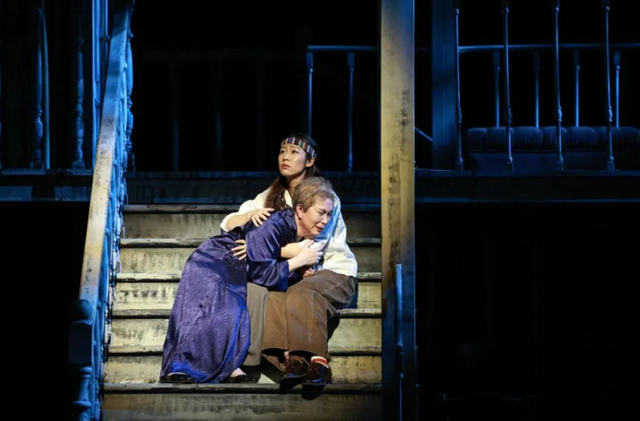 二层与三层则摒弃了真实的墙壁与窗户,代之以粗细不一的木构线条,勾勒出屋顶与栏杆的轮廓。这一通透的处理,不仅拓展了视觉层次,也为表演提供了更多空间可能。随着转台缓缓转动,小楼的每个角落皆可成为表演区域,与左侧的书房、右侧的花园共同构建出流动的叙事场景。
