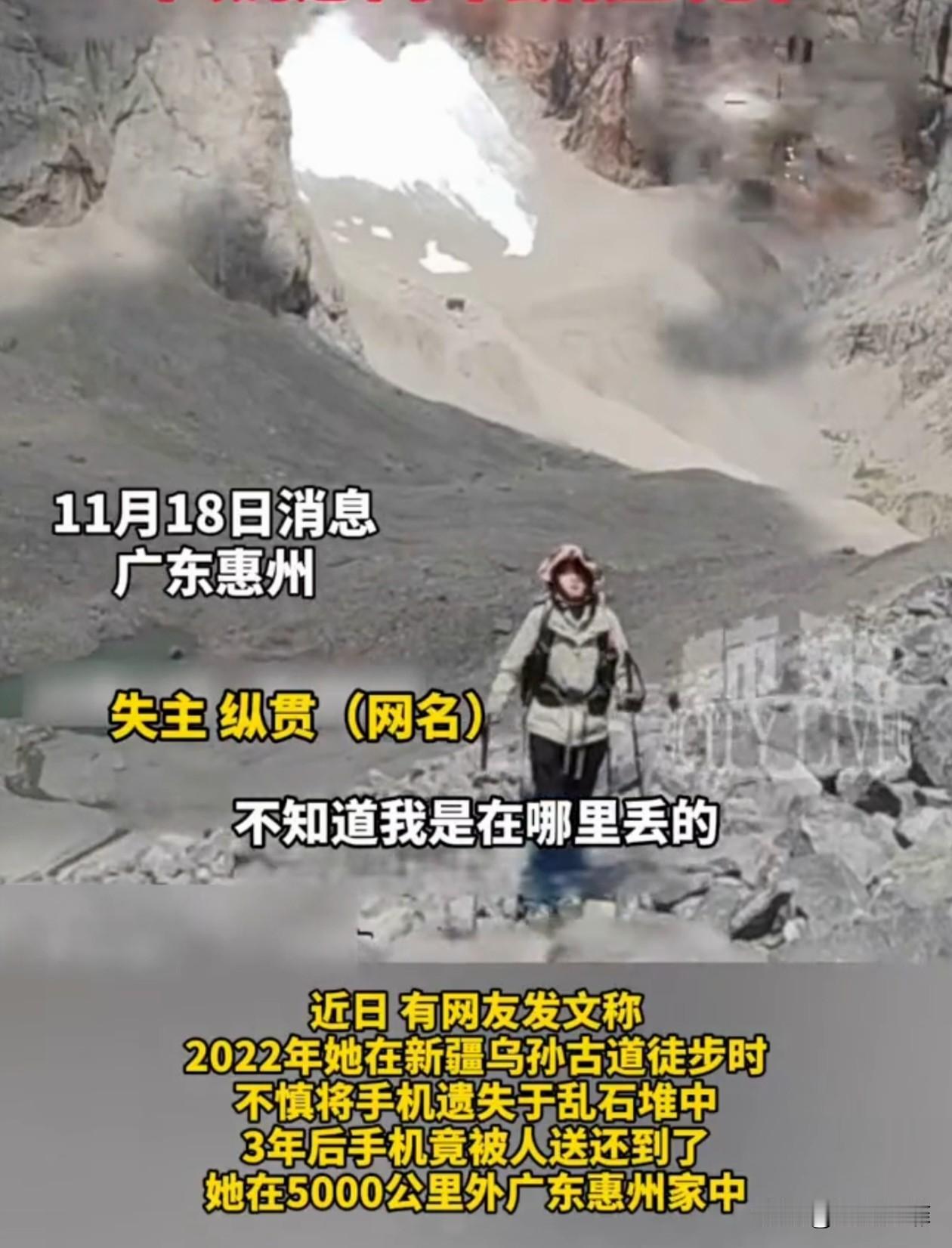 这是什么缘分!广东,一女子去新疆徒步,手机不小心落在了乱石堆,3年后竟被一小伙跨越5000公里送还,更巧的是,两人住的小区相距只有4公里,约饭后成为朋友。 2022年7月,女子和朋友在新疆乌孙古道徒步,她的手机被朋友放在石头上拍照,滑进了石缝里,几人找了一两个小时也没找到,就彻底放弃了。 ​今年7月,深圳的一位小伙恰巧路过了那个地方,无意中发现了这部手机,手机上挂着一张惠州小区的门禁卡,他给手机充了电,却发现手机卡已注销,联系不上失主。 ​ 小伙本来打算日后去惠州看朋友的时候,顺便找失主,巧的是,10月份他因为工作生活变动,在惠州买了房,还发现失主所在的小区离自己新家只有4公里。 之后,他找小区物业帮忙,物业很快联系上了女子。 女子一眼就认出了这是自己丢失3年的手机,当晚就和丈夫请小伙吃饭道谢,两人相谈甚欢,最后还成了朋友。 对女子来说,这部手机值不了多少钱,但里面存着当年许多照片,这些找不回来的回忆才最珍贵。 小伙的善良和坚持很难得,他没有半途而废,也不嫌麻烦,主动找物业帮忙联系失主,真的很有心。 两人吃饭聊得投缘,最后成了朋友,就是最好的结局。善意不仅没白费,还收获了意外的缘分。