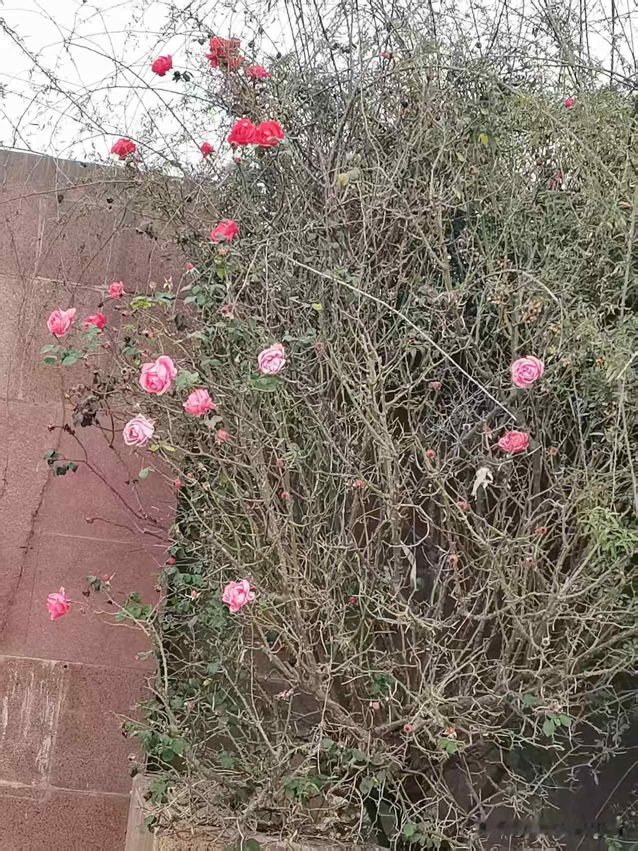 偶遇这冬日里的月季花,也太会“撑场面”了!满枝桠都是干巴巴的细枝条,看着都萧瑟,结果冷不丁冒出几朵粉的红的花,裹着薄薄的花瓣,在冷风里还挺精神。 也不知道它咋扛住这降温的,叶子几乎都掉没了,旁边的草也都蔫了,就它又开又冒花苞,像在说“冬天咋啦,我照样开花”。瞅着这蔫枝配娇花,还挺有那股“倔强美”,冷天里看着还挺暖心的。