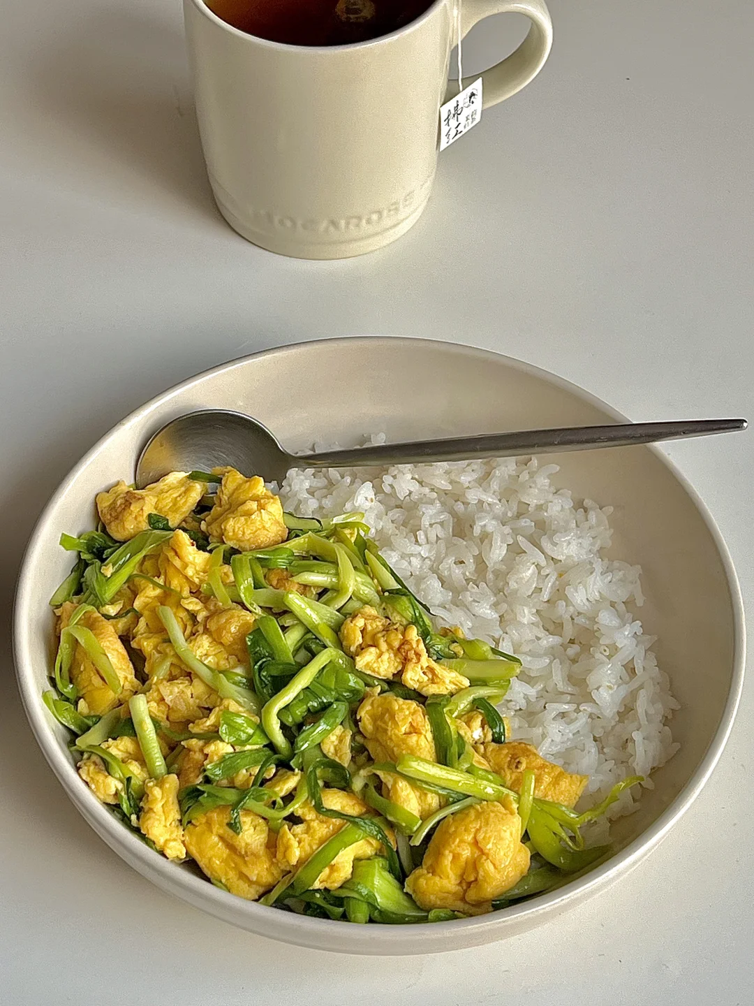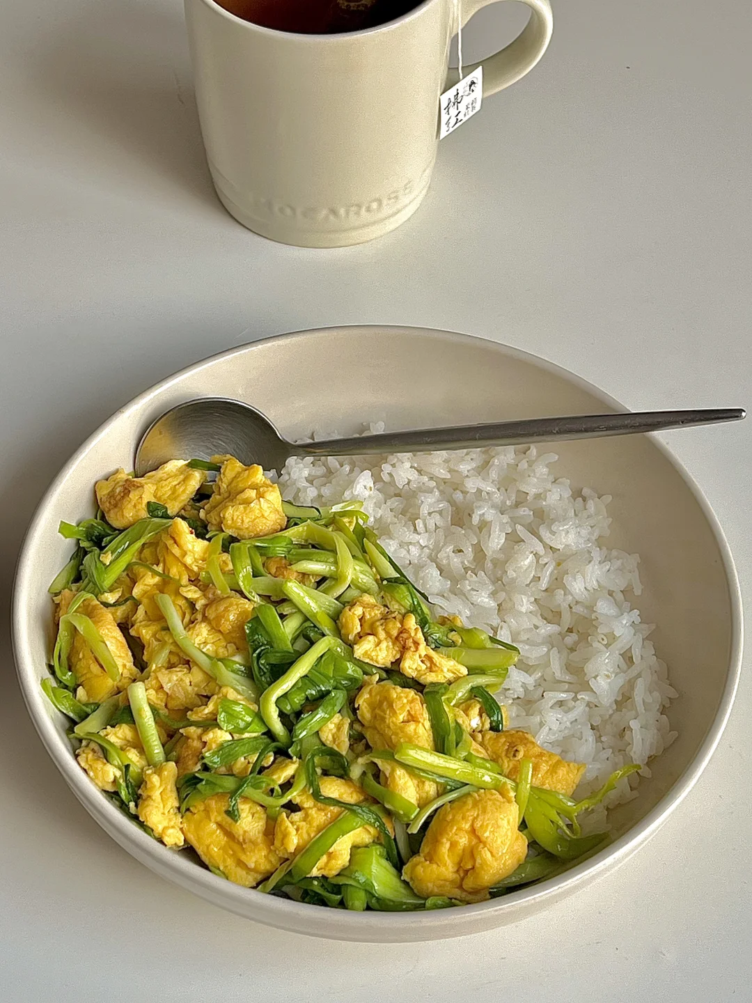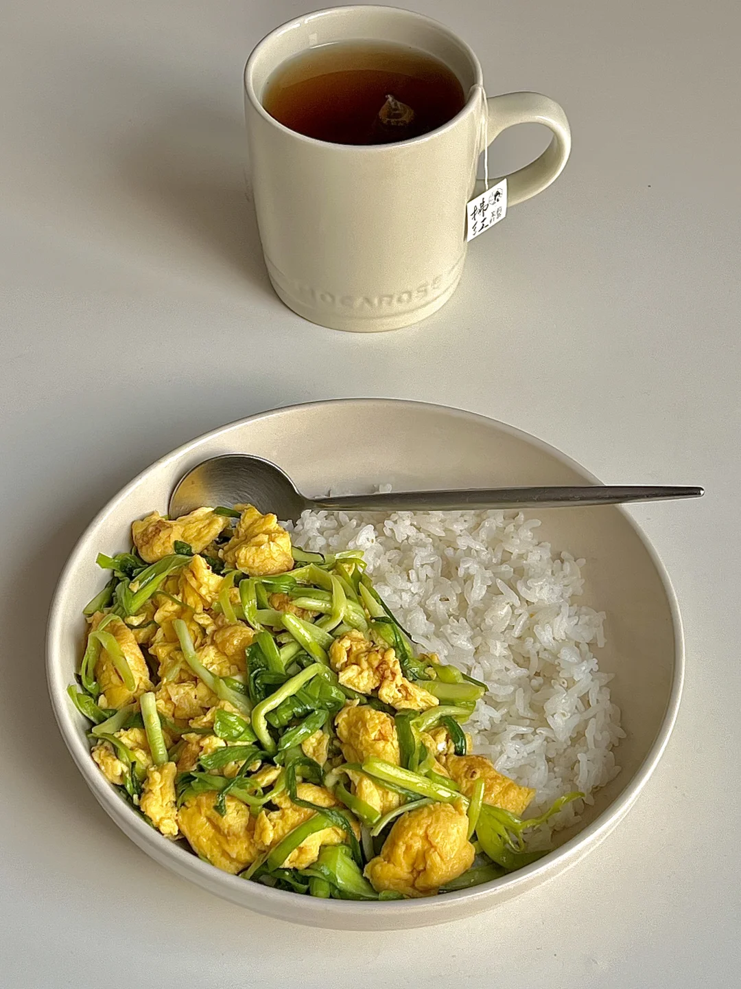 今日份一人食健康午餐分享: 韭黄炒鸡蛋 白米饭🍚 一杯茶 . 食材:鸡蛋 韭黄 做法如图上⬆️ . 韭黄炒鸡蛋好鲜美啊😋