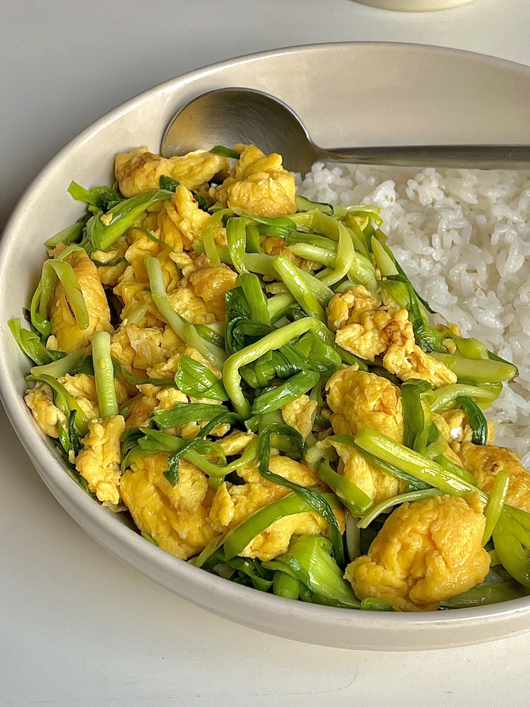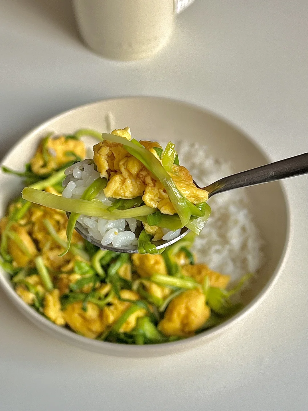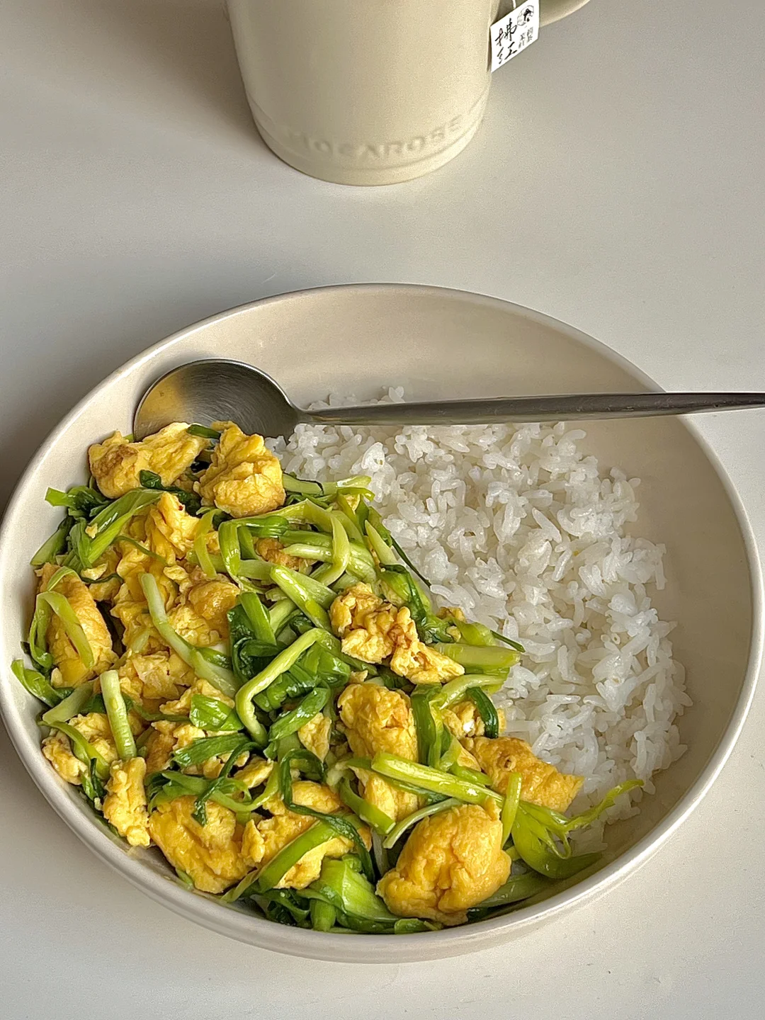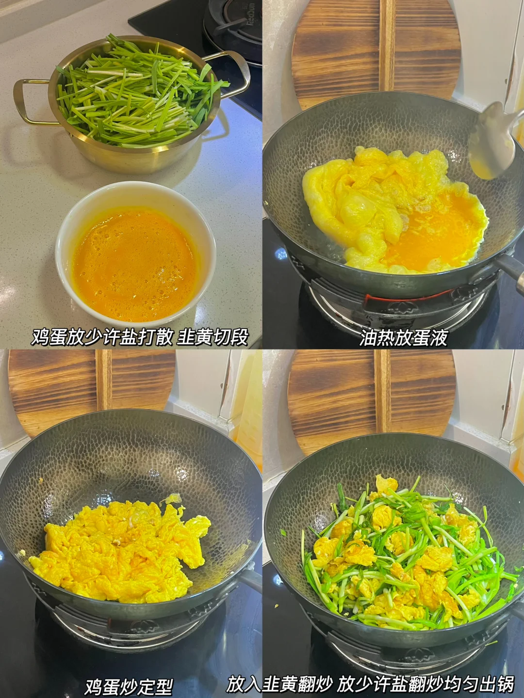 今日份一人食健康午餐分享: 韭黄炒鸡蛋 白米饭🍚 一杯茶 . 食材:鸡蛋 韭黄 做法如图上⬆️ . 韭黄炒鸡蛋好鲜美啊😋