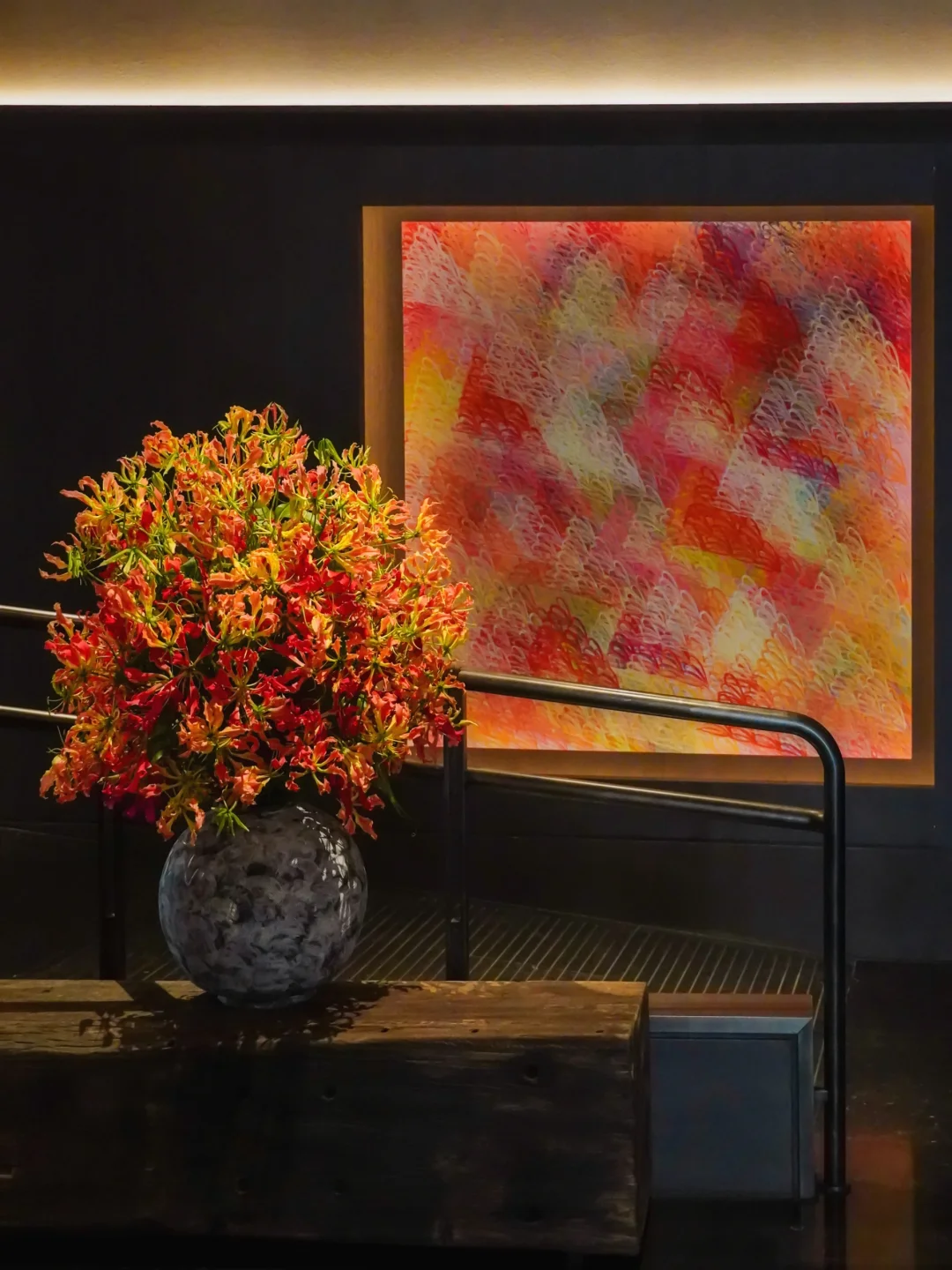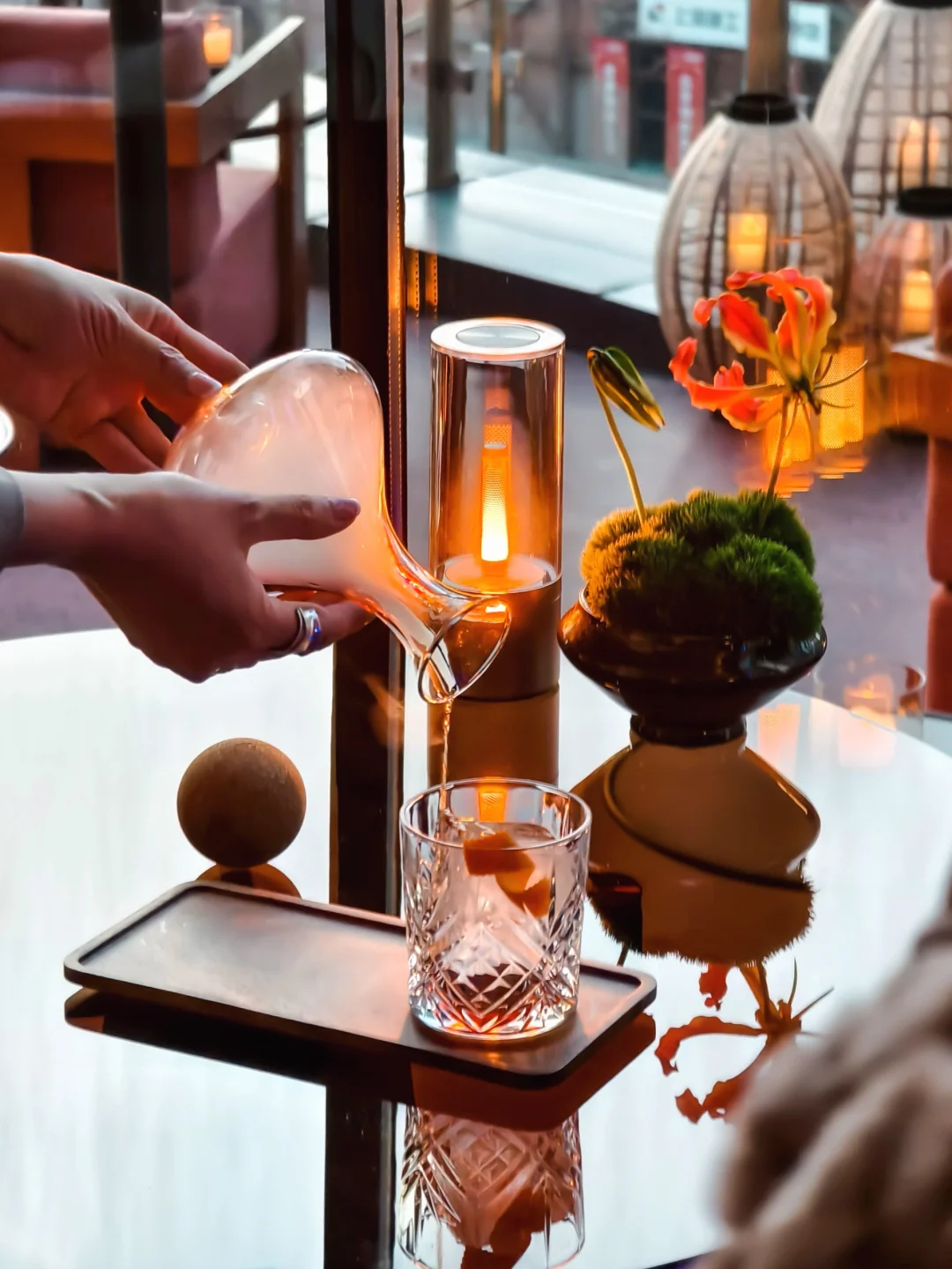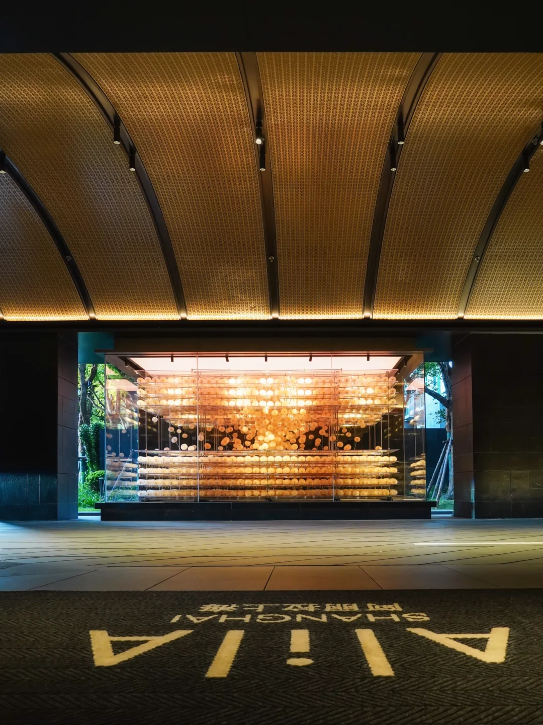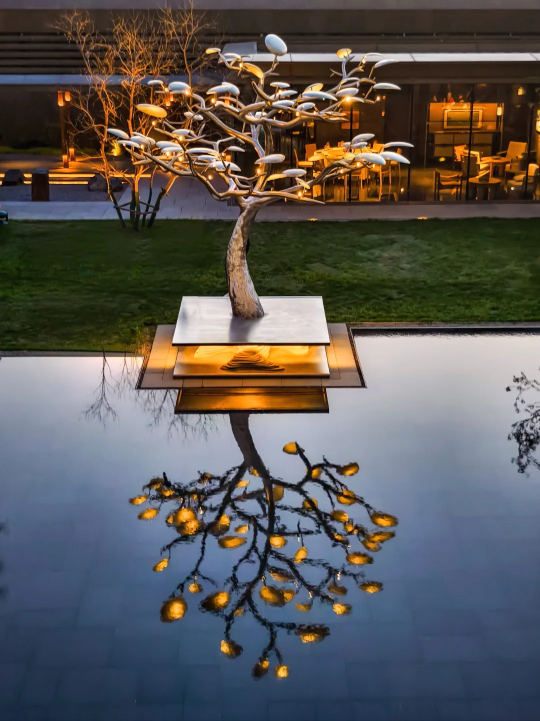 ❸ 中庭树聚:晚上6点入夜仪式,灯光亮起,斜靠栏杆拍剪影,氛围感直接拉满
