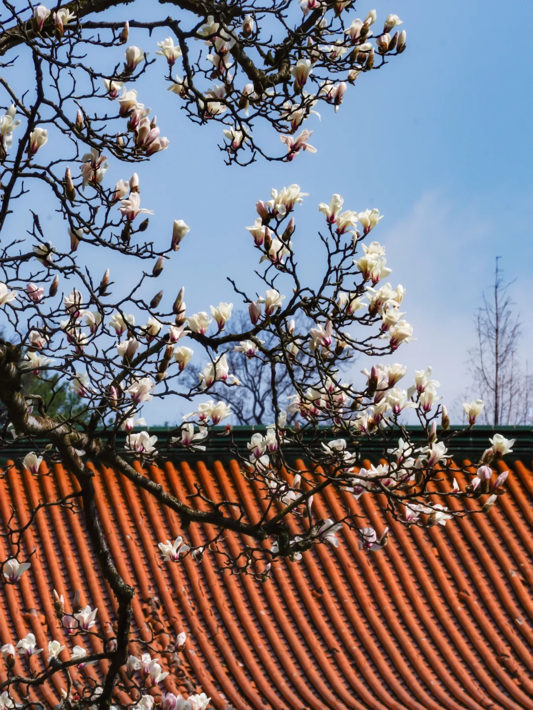 拾阶而上,玉兰与青瓦飞檐相映成趣