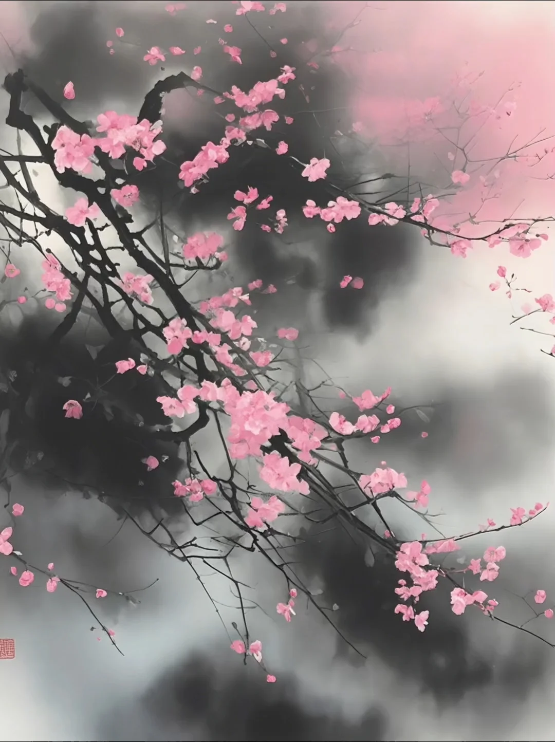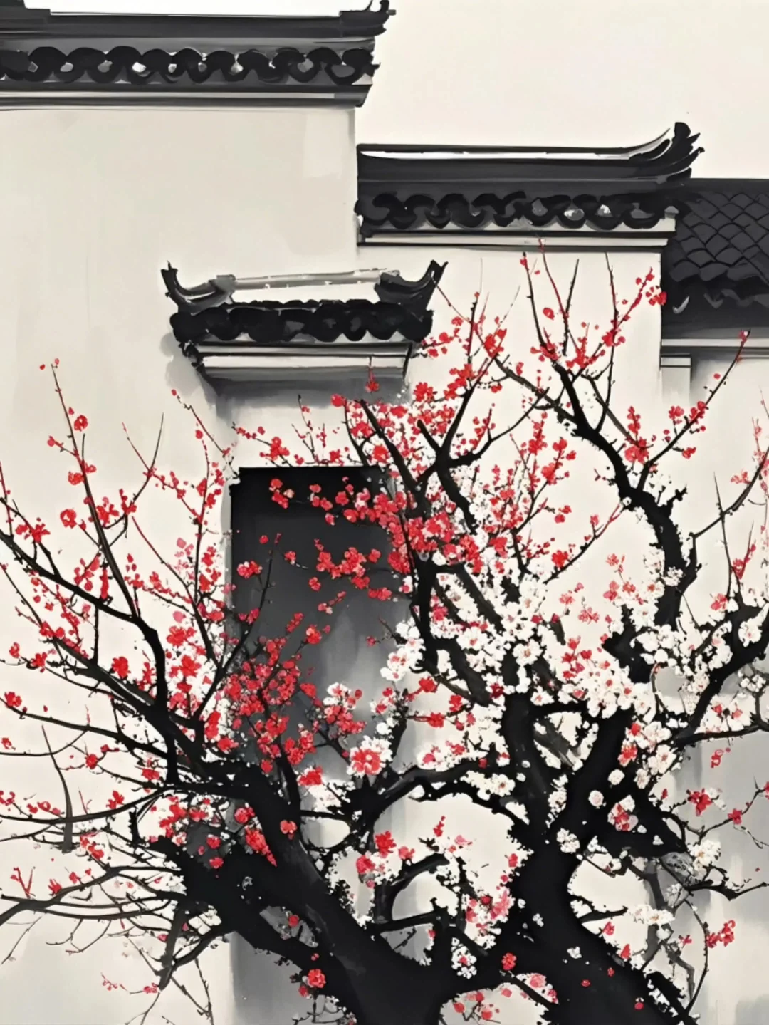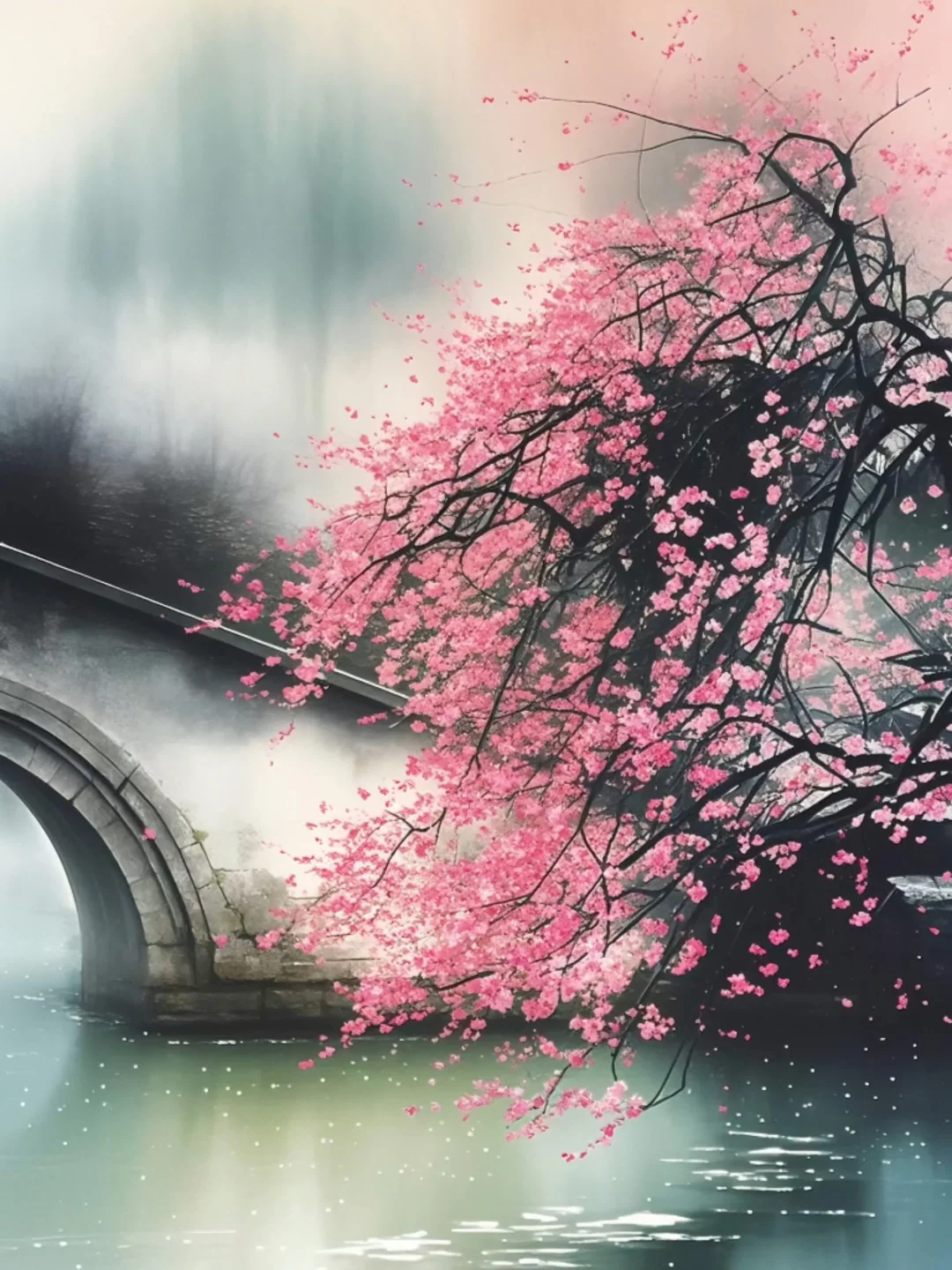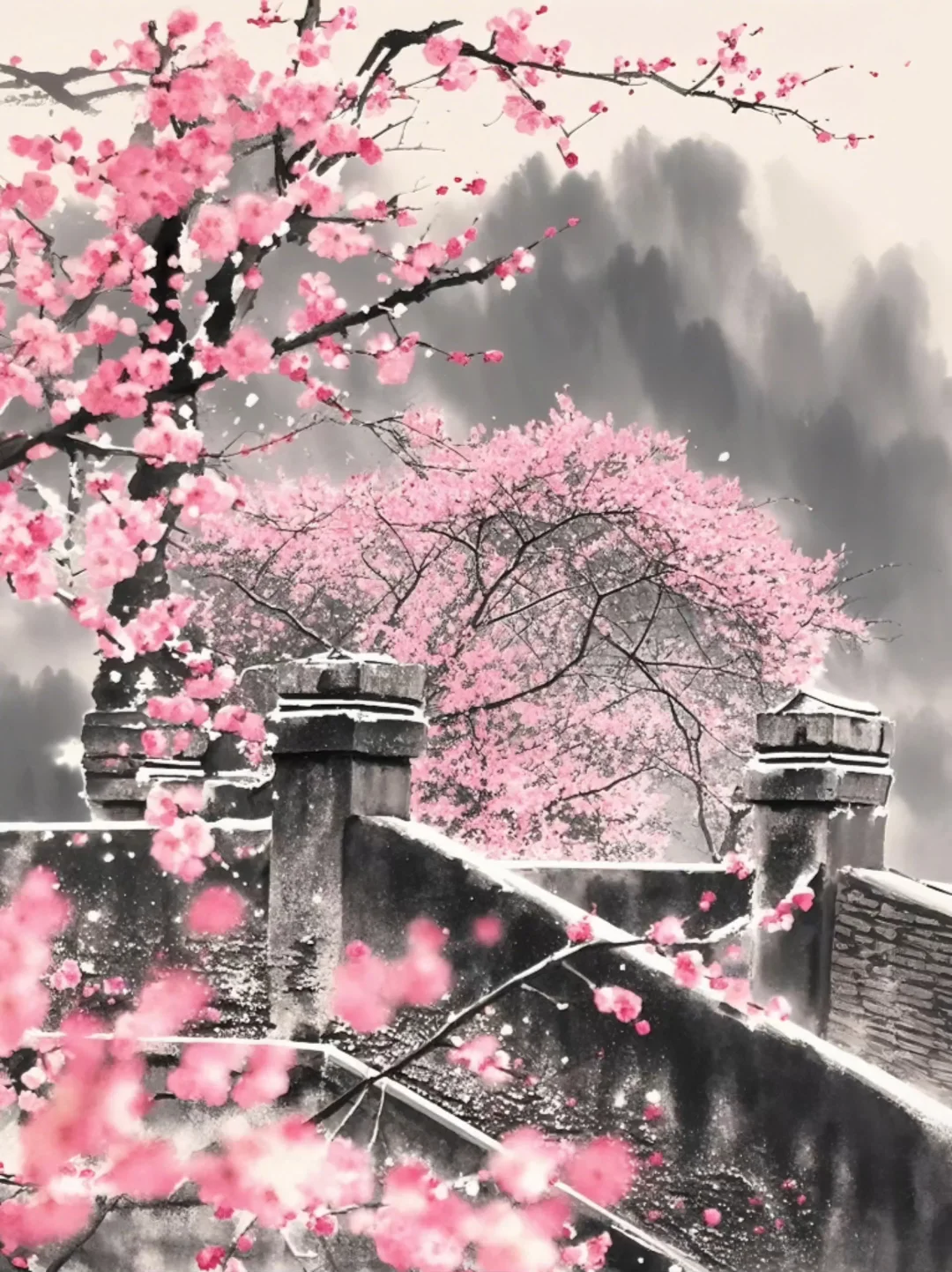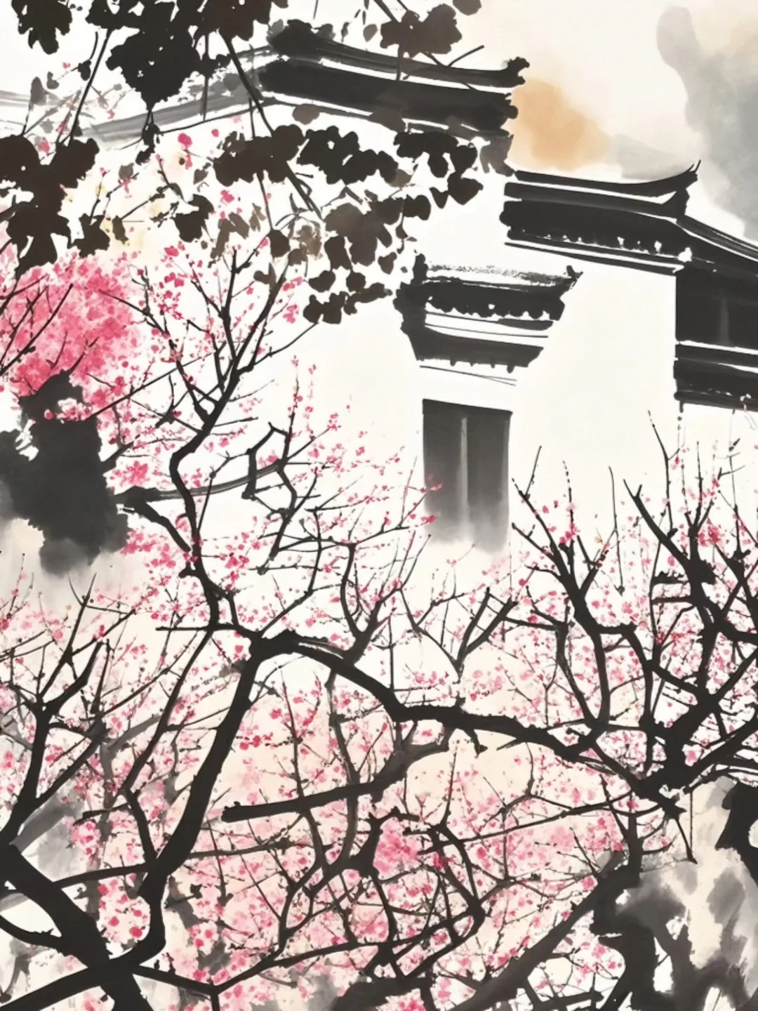- 谁说雨天不能出片?! 超山的梅林在雨里美到失语 用AI把雨幕融进水墨笔触🌫️ 每一帧都像从古画里抠出来的!! live图看雨滴在花瓣上蹦迪💃 湿漉漉的青石板+雾紫色远山 魂穿古人笔下「一蓑烟雨任平生」的意境 -