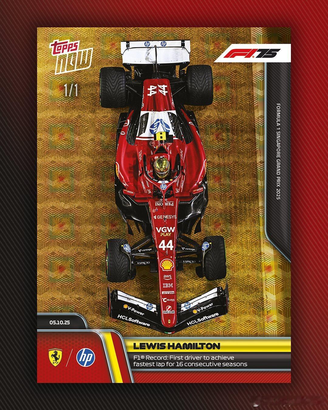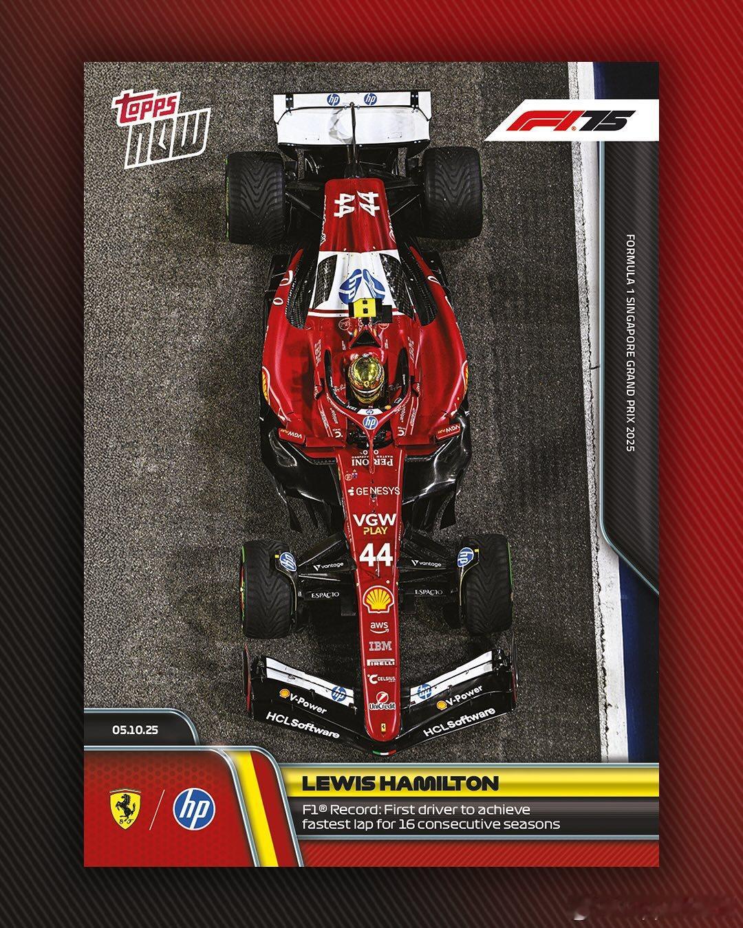 ✨卡片背后有每一个值得记录的瞬间📷 新加坡大奖赛,汉密尔顿连续第16个赛季刷出最快圈,Topps Now用卡片记录这一伟大的成就🏎️🔥本周末F1 拉斯维加斯大奖赛即将开战,你希望谁在这条赛道上创造新的故事,留在新的卡片?