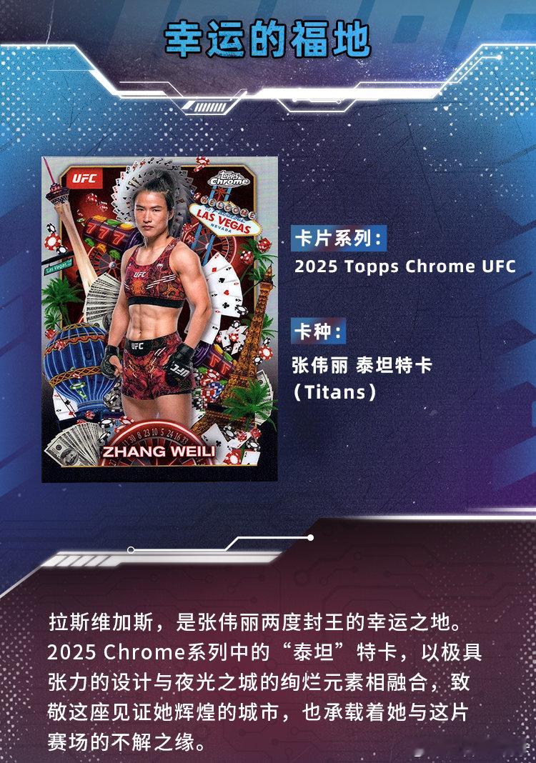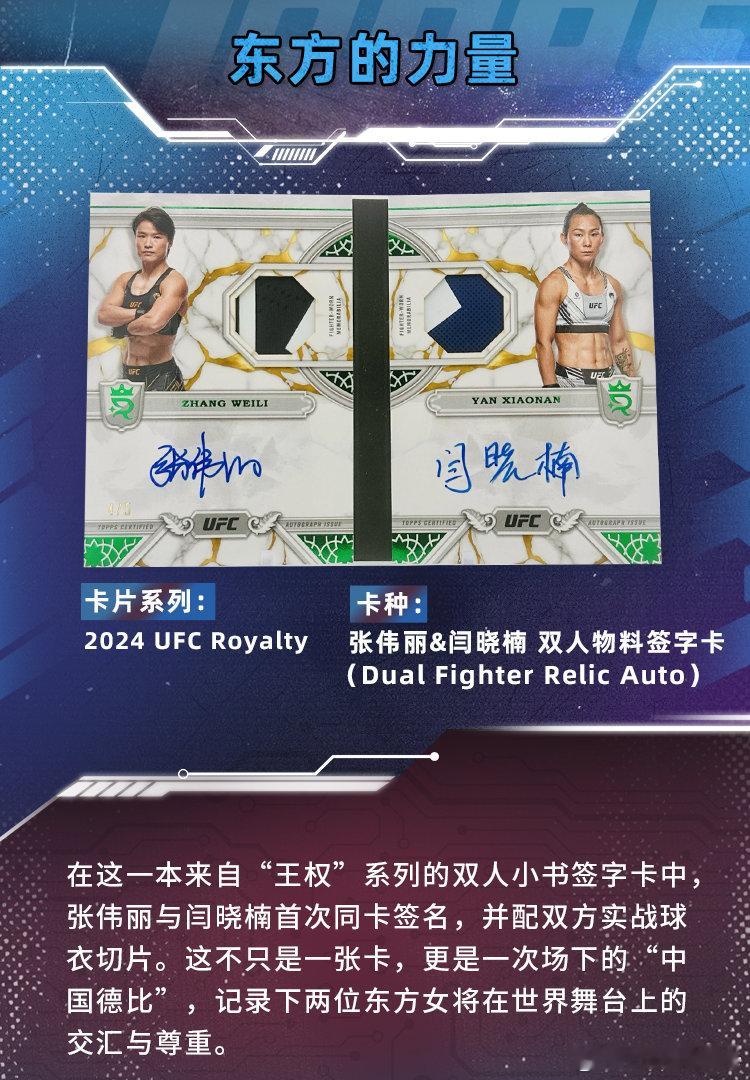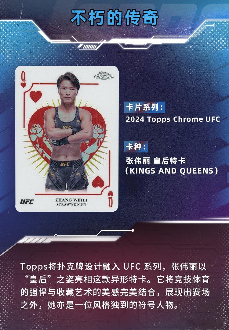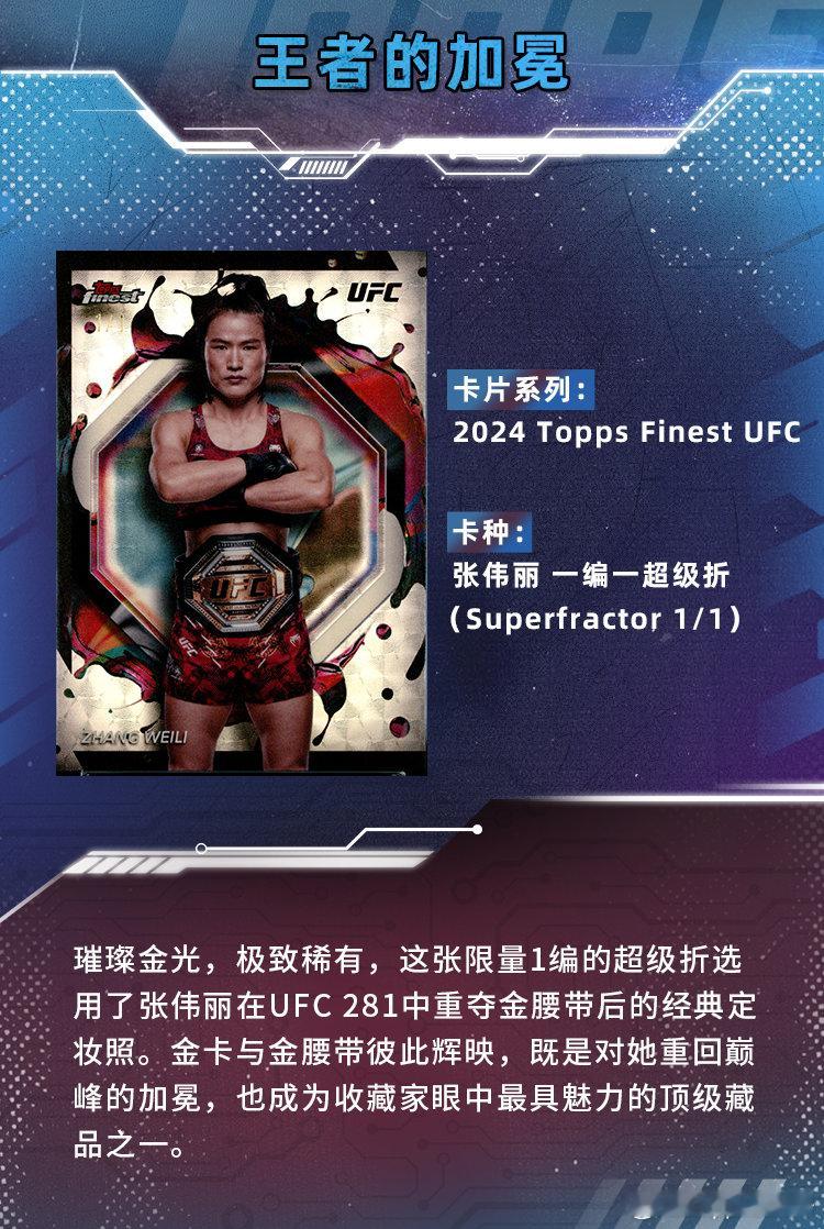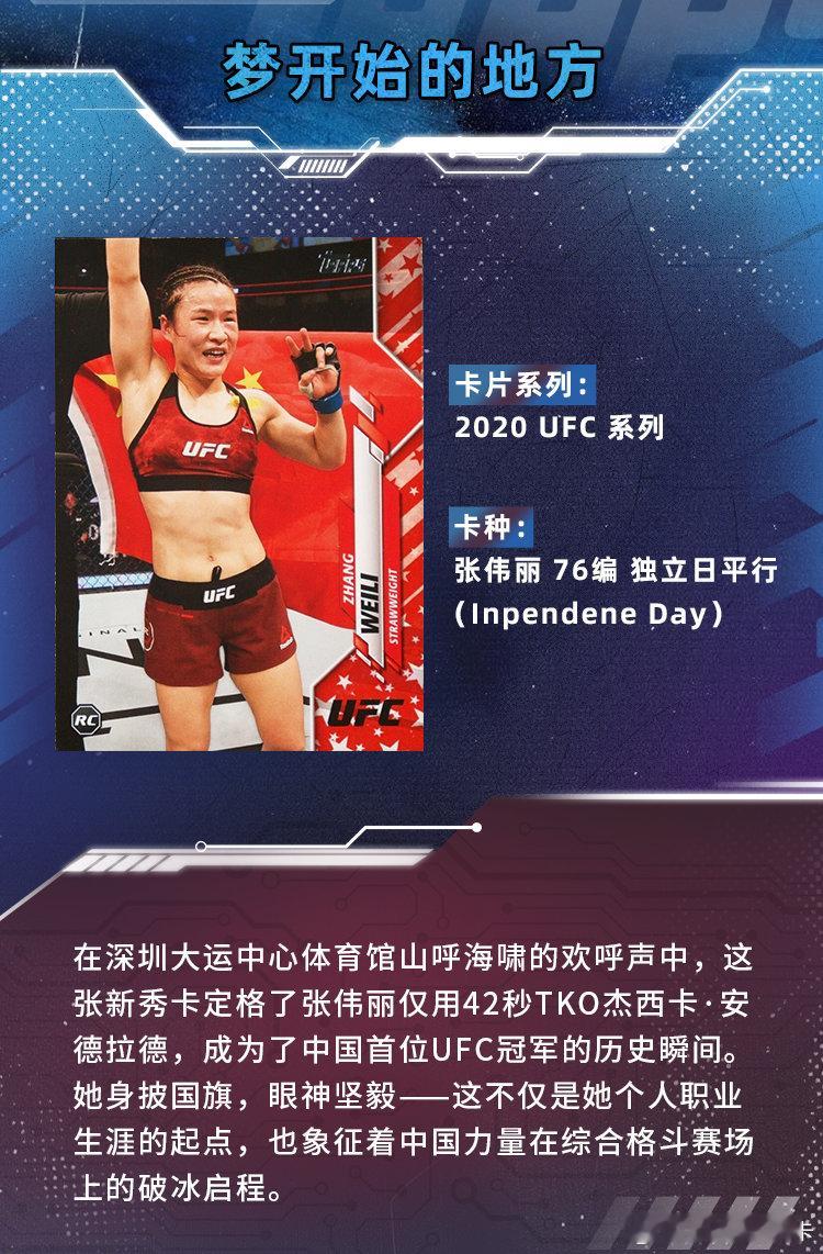 🇨🇳 每一张卡片,都是让每一个不可复制的瞬间获得实体承载。❤️还记得你是如何爱上收藏的吗?今天我们从5大角度为你盘点张伟丽的5张Topps卡片:1️⃣ 选图的故事:定格她身披国旗的夺冠瞬间2️⃣ 限量的魅力:限量编号卡见证稀缺价值属性3️⃣ 设计的巧思:特殊的卡片设计再现八角笼灯光璀璨4️⃣ 情感的共鸣:来自东方的双人签字激发你的民族自豪感5️⃣ 别样的乐趣:特卡背后与她生涯的巧合故事🌟 每张卡都在讲述一位背后的故事,当你把它们串联起来——就是一部由你亲手组建的「球员成长录」
