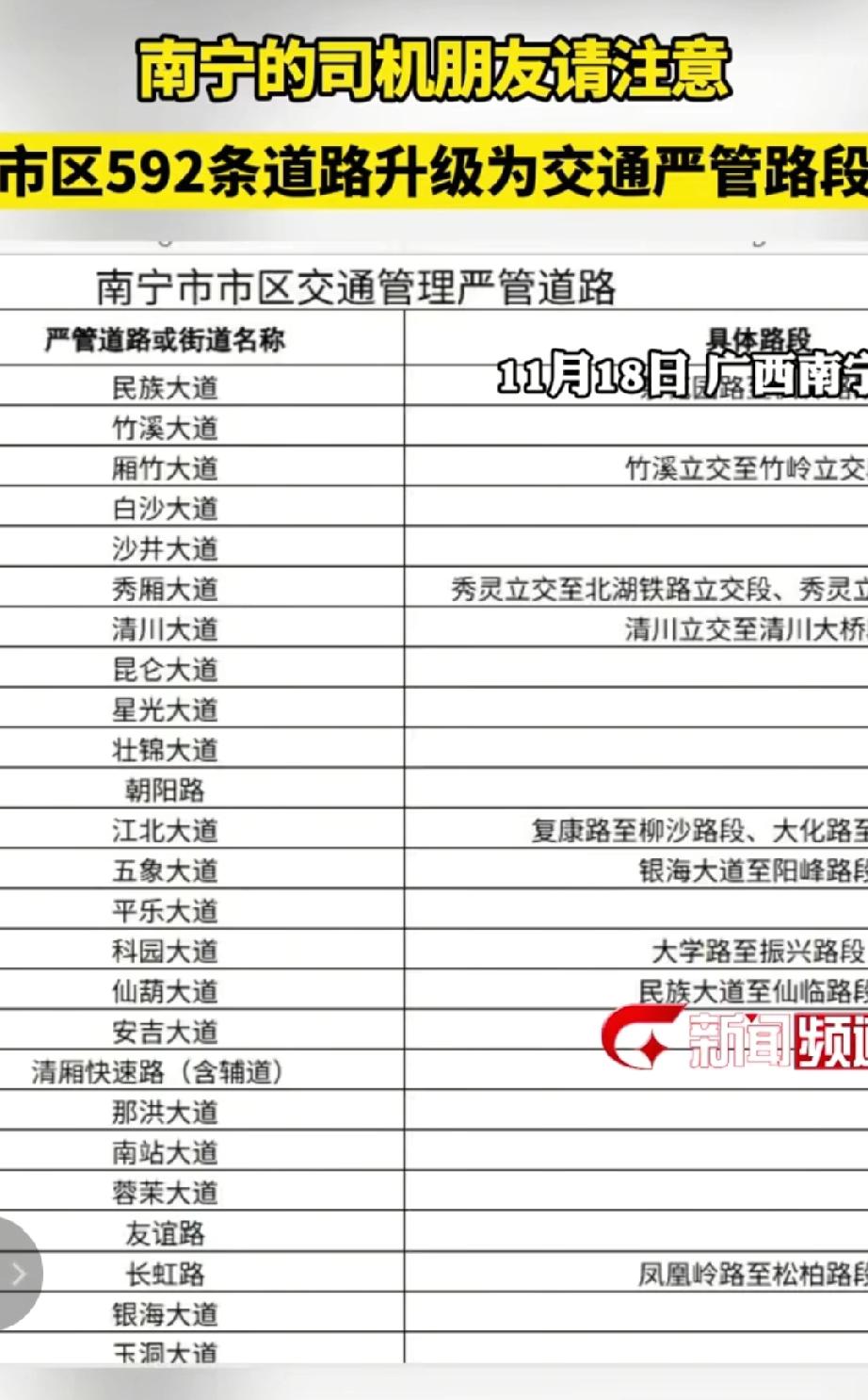 南宁的司机朋友请注意,南宁市区592条道路升级为交通严管路段。从11月17日起,每天7:00-22:00严查,严查的交通违法行为包括违停、占用人行道、闯红灯、逆行、不礼让行人、电动车超员、骑车看手机等。这些严管路段全程电子抓拍加现场执法,市民需文明出行,遵守交通规则。(来源于@广西新闻频道 )