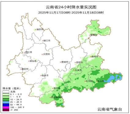 降水方面,昨天文山州南部、红河州南部、西双版纳州东部出现中雨局部大雨,昭通市北部、曲靖市南部、文山州北部、昆明市东南部出现小雨,其他地区晴间多云。