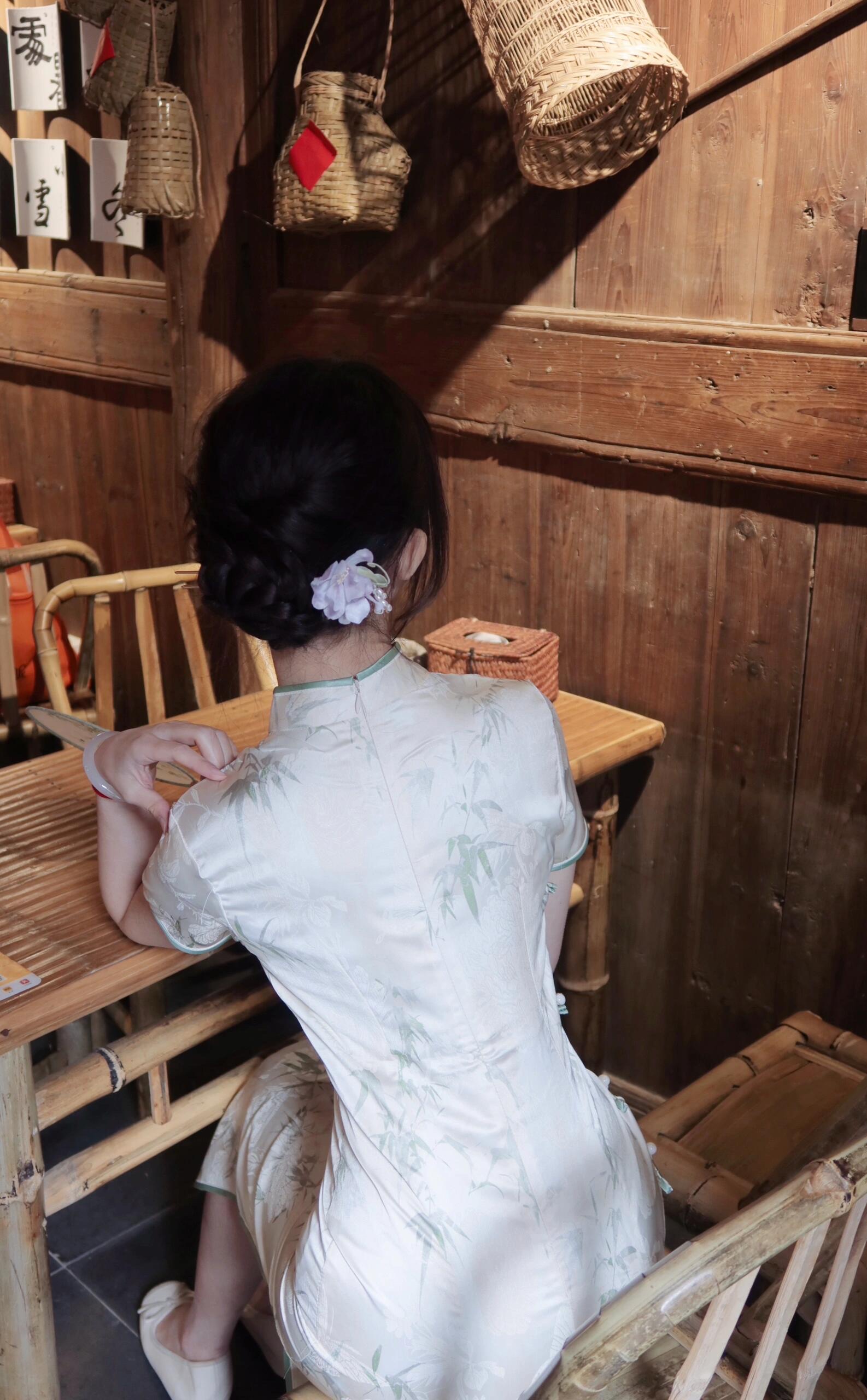 竹影浸在风里,指尖落向琴弦时,瓷青纹样正顺着旗袍漫成一弯浅溪。发梢坠着碎光,