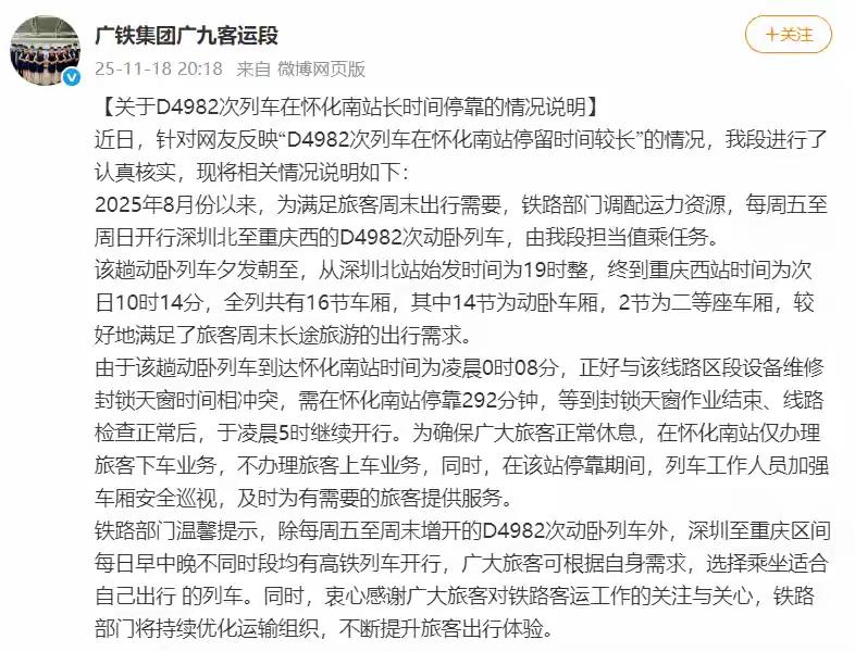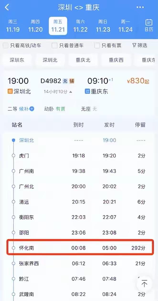 惊爆全网!深圳开往重庆D4982次列车深夜停靠292分钟,乘客竟在怀化南站体验“