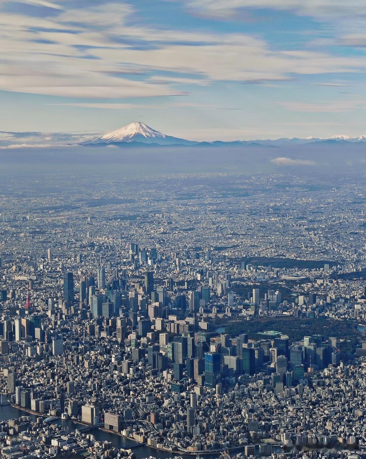 在飞机上俯视整个东京,建筑物密密麻麻,还有远处的富士山,十分震撼!