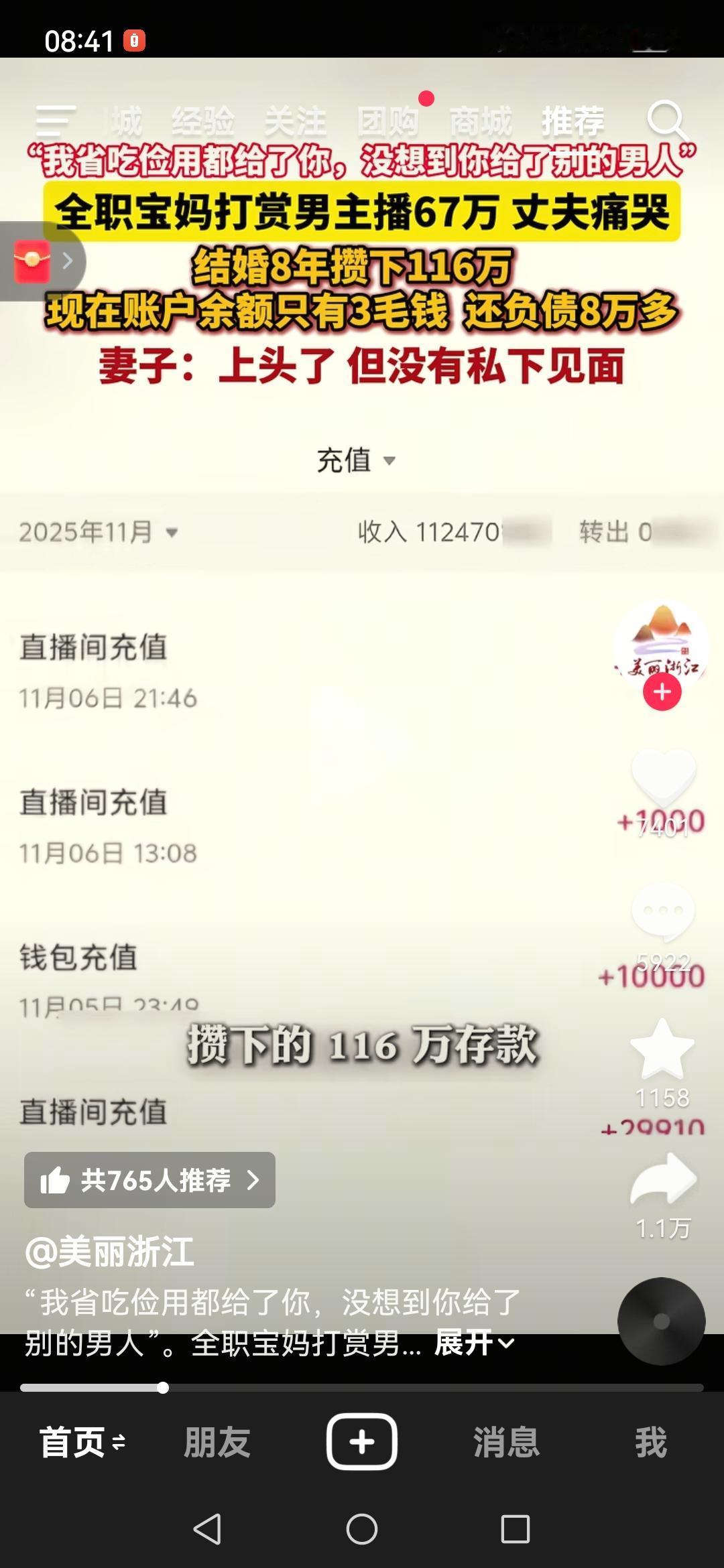 11月17日,河南郑州的刘先生,他省吃俭用8年攒下116万,全部交给当全职宝妈的妻子,结果妻子却将其中67万用于打赏男主播,导致账户只剩3毛钱,还倒欠网贷8万多。 自己在外租300块的漏雨房打工,对妻子心灰意冷,哭着表示“不爱了,死心了”,并考虑离婚且追回财产。妻子则称打赏是因为“上头了”,帮主播打PK,强调未与主播私下见面。 男人呐,还是把钱捏到自己手里吧。正所谓:巧妇难为无米之炊,有米自有巧妇来炊。