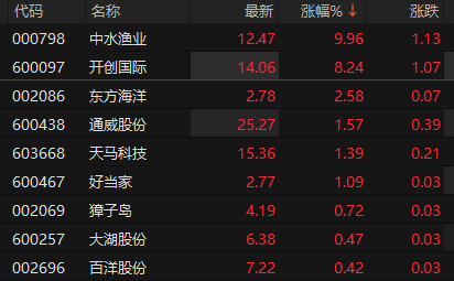 上证报中国证券网讯11月19日早盘,水产养殖板块领涨,截至9时32分,中水渔业4连板,开创国际涨超8%,东方海洋、通威股份、獐子岛、大湖股份等纷纷走高。