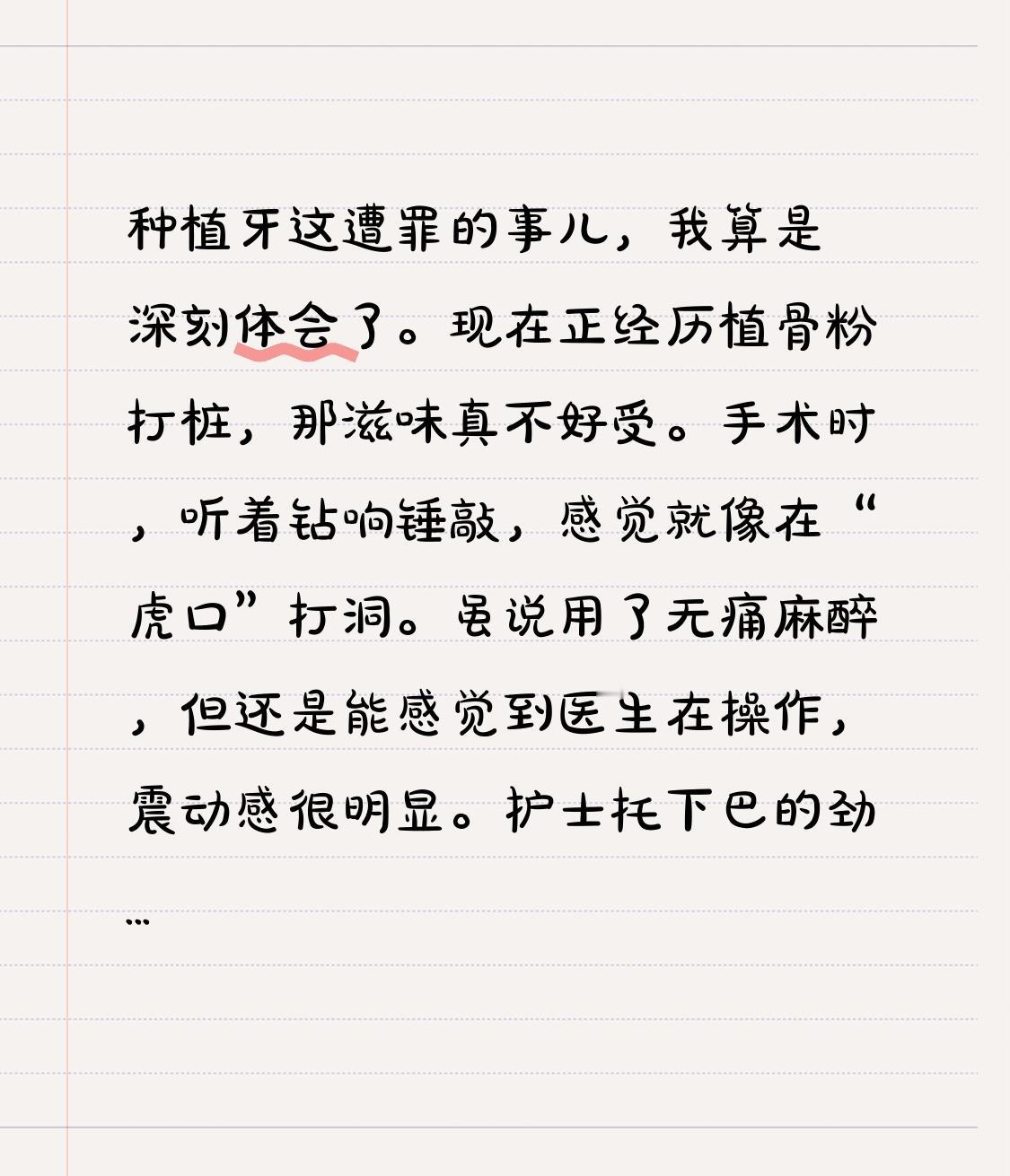 种植牙这遭罪的事儿,我算是深刻体会了。现在正经历植骨粉打桩,那滋味真不好受。手术