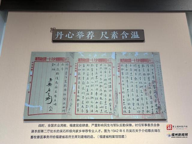档案展现了吴石始终如一的桑梓情怀。展出的多封亲笔信函勾勒出他对家乡的深切关怀:1942年,吴石当时虽远在柳州,仍心系福建疫情,特致信省主席举荐兽医人才蔡庆璋,以解家乡兽疫防治的燃眉之急;1946年6月,身为福建旅桂同乡会会长的他,仍心系教育,为黄花岗纪念小学申请办学补助,延续其对闽人子弟教育的一贯支持;1949年,在时局动荡之际,他仍不忘致信省政当局,详细列举学者魏应麒在福建文化民俗方面的研究成果,并竭力举荐,展现出对故乡文脉传承的执着坚守。